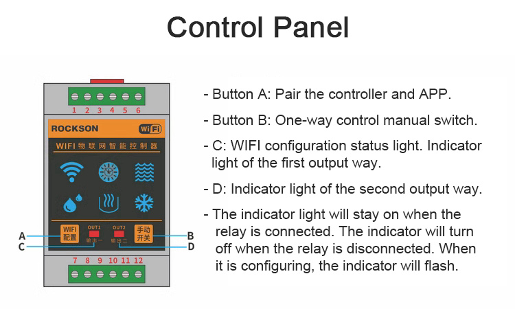1. Wire according to the wiring diagram. After the first power-on, wait a few seconds, indicator 1 will flash quickly, and the device will enter the WIFI configuration mode by default. Note: If the device has already been added to the app, when reconfiguration is required, press and hold the configuration key in the working state until indicators 1 and 2 flash at the same time, and then release the button. At this point, the device enters intelligent configuration mode. If the router is not compatible, you can press and hold the configuration button again at this time, and the indicator 1 and 2 will flash slowly, and enter the compatible configuration mode at this time.