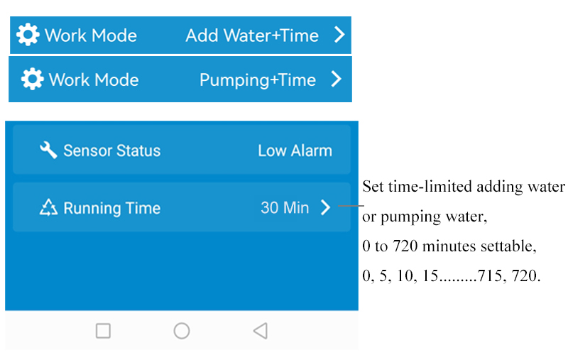 For example: Preset alarm lower limit of water level is 25% and alarm upper limit is 75% . When water level is lower than 25% or higher than 75% , it will push alarm notification to users' smartphone via APP.