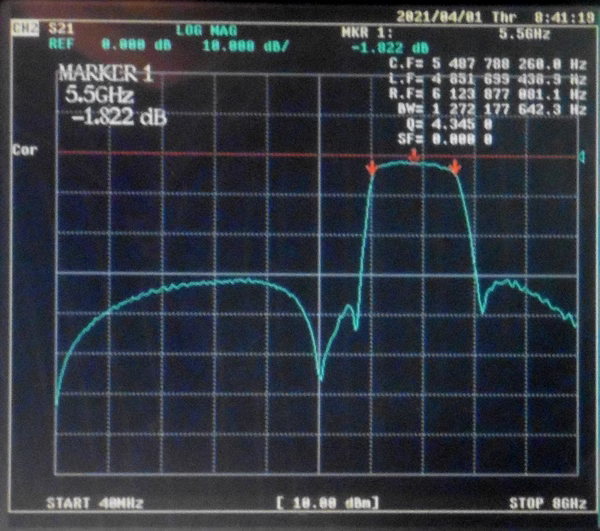 The center frequency of this bandpass filter is 5500MHz and the 3 dB bandwidth is about 1200MHz. It adopts a multi-layer thin-film circuit structure with non-sharp cut-off characteristics. It is used for anti-interference and performance optimization of 5.8G UWB, WiMAX, WiFi and other wireless system receiving devices. It can effectively filter out out-of-band signals, reduce noise and increase dynamic range.