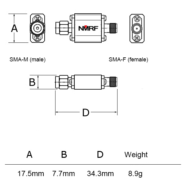 - Interface: SMA-M and SMA-F (RF characteristics are symmetrical at both ends, non-directional)