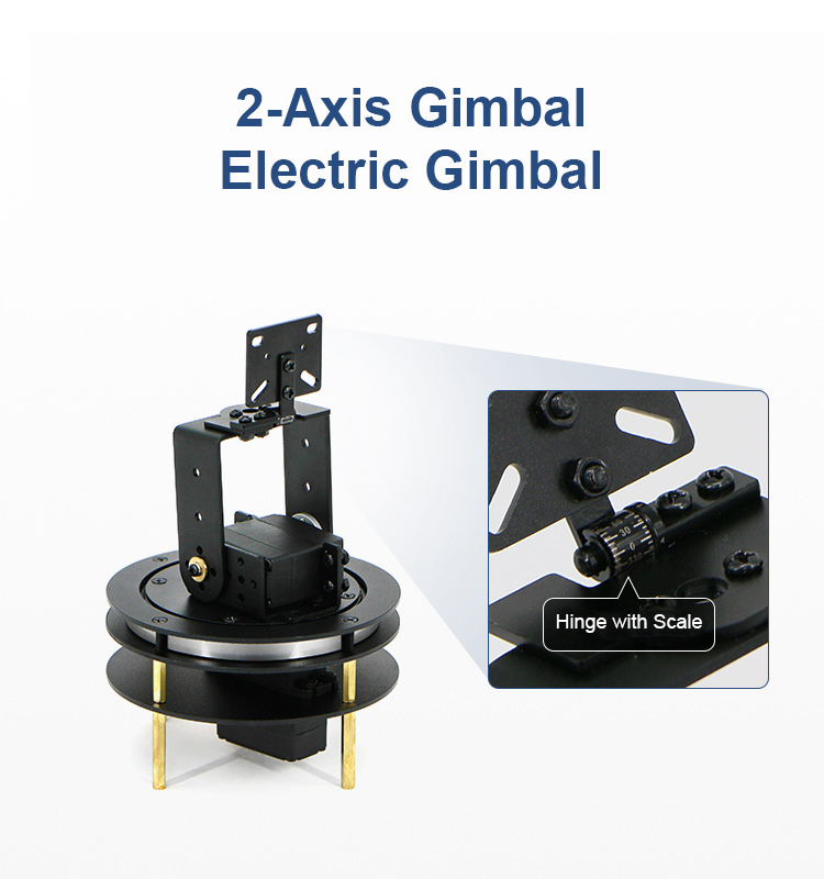 * The two-axis gimbal can perform two-degree-of-freedom motion in both horizontal and vertical directions. The servo motors provide 20KG of torque when powered at 5V, and 23KG of torque at 6.5V. In a stalled condition, the servos can provide more than 30KG of torque.