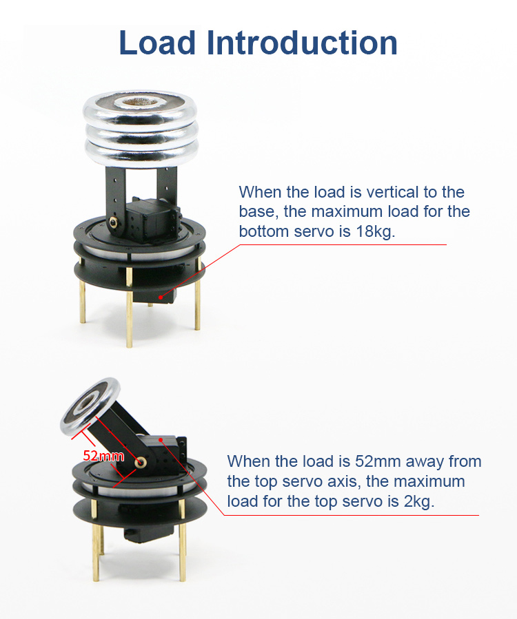 * When the load is vertical to the base, the maximum load for the bottom servo is 18kg.