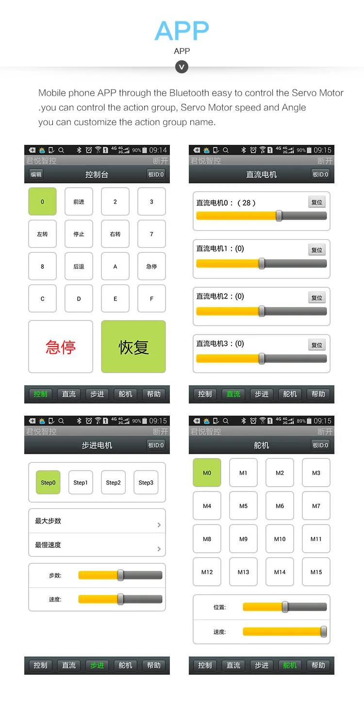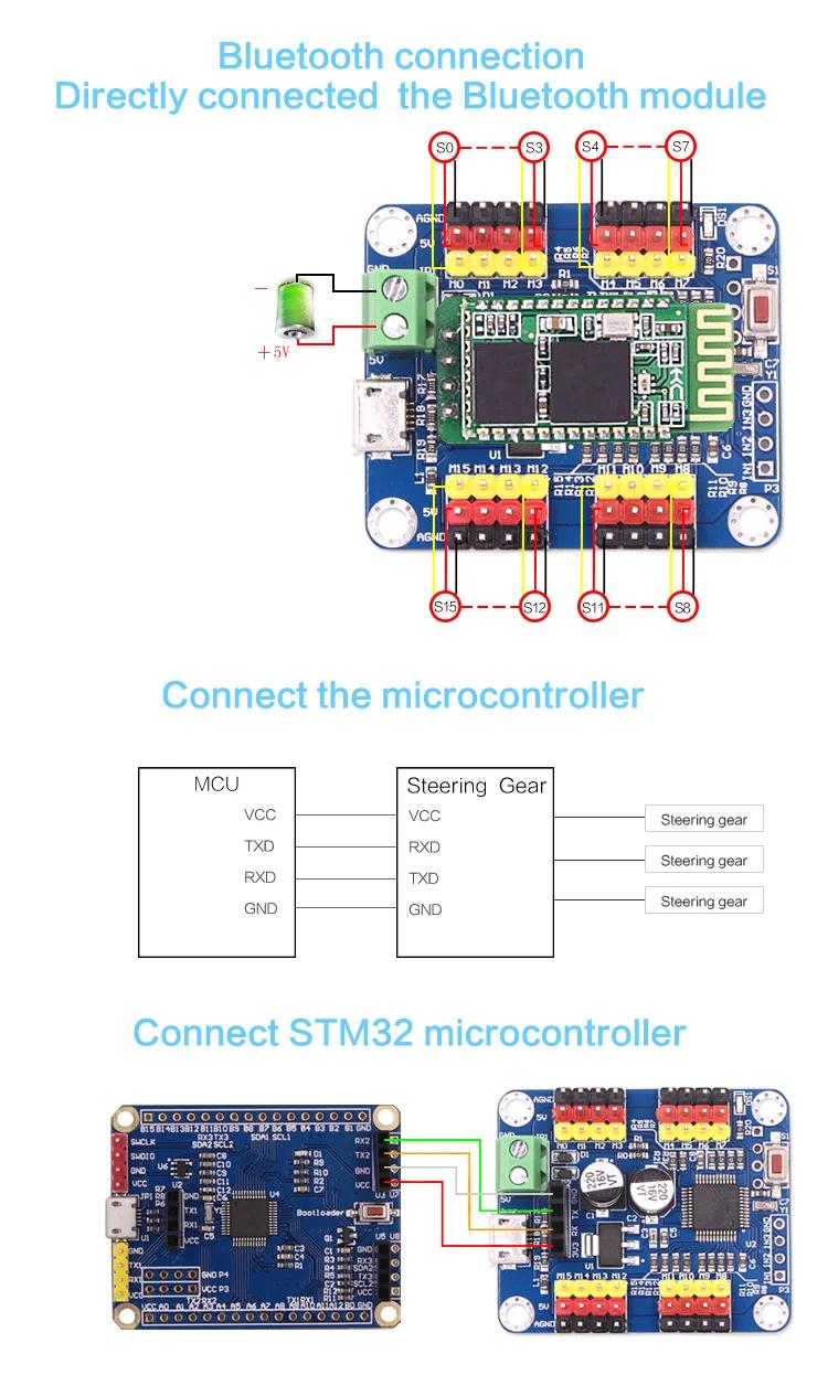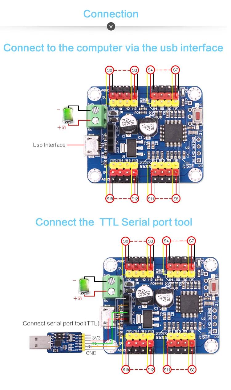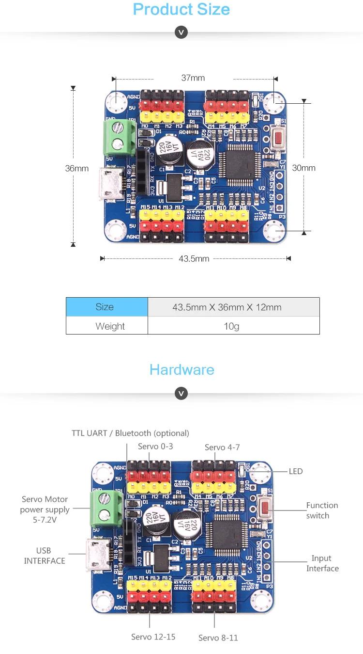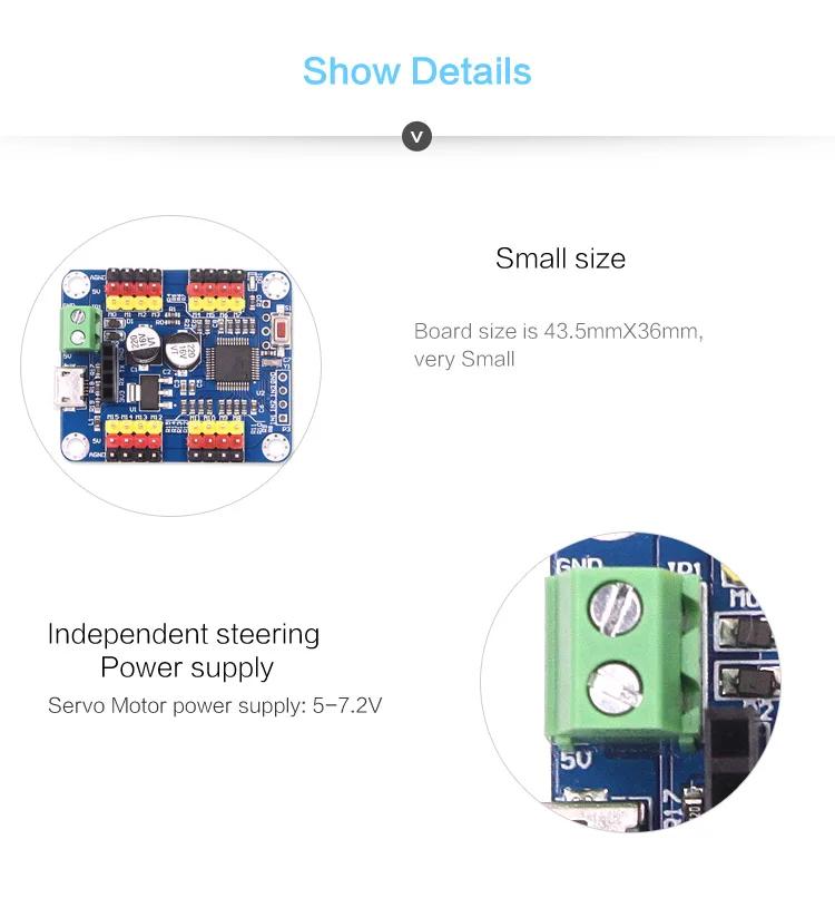 - Using voltage: USB power supply 5V, servo motor power supply 5 ~ 7.2V