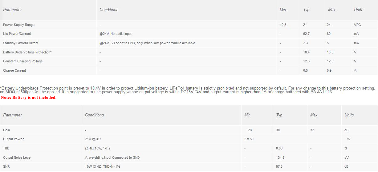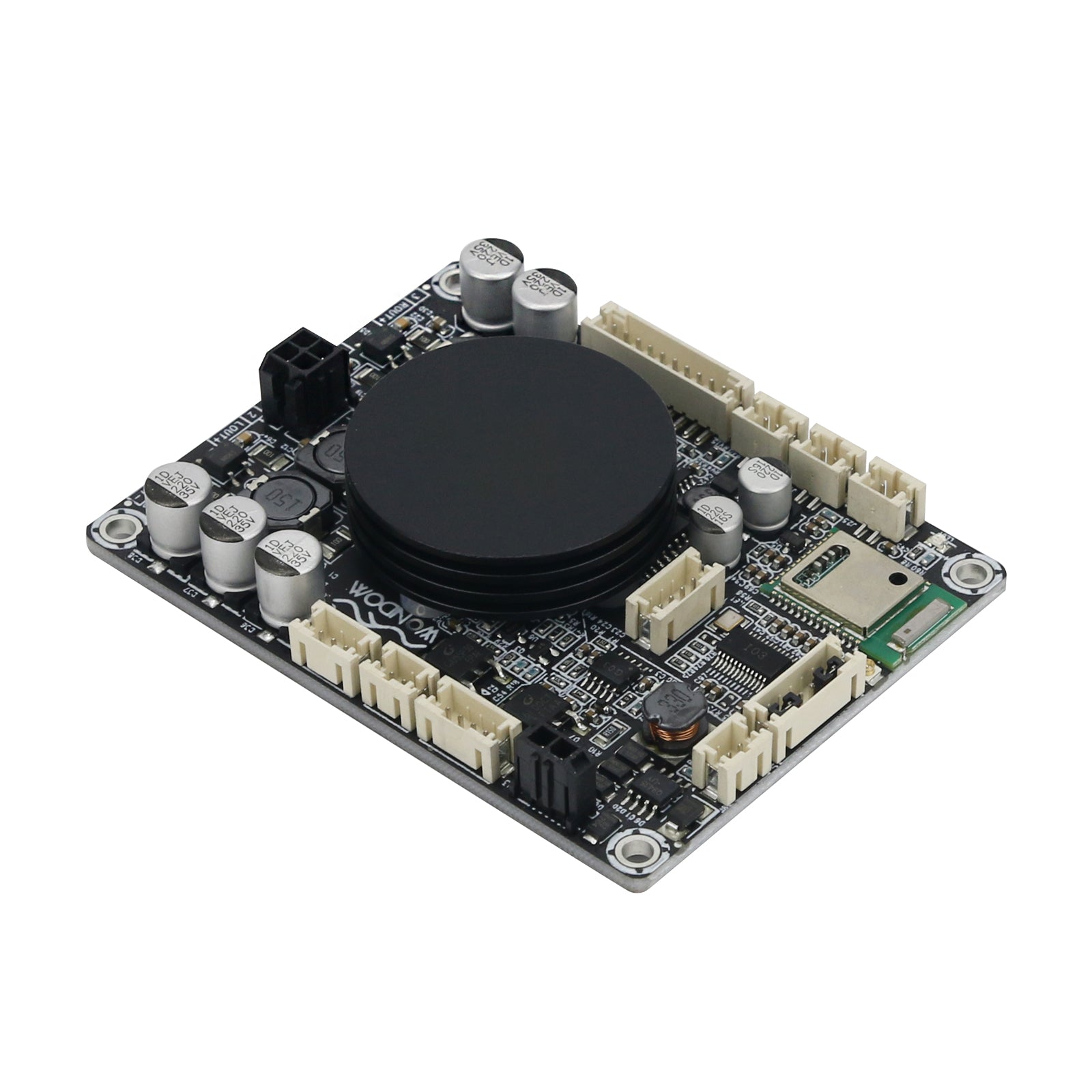 It is audio amplifier board integrated with Bluetooth 5.0 (supporting for aptX HD) and DSP, offering a real all-in-one audio solution for customers. JAB2-250 covers 2 x 50W, 2 x 30W, 1 x 60W and 1 x 100W four models. Thanks to the equipped DSP chip, JAB2-250 supports PC UI control after connection with WONDOM ICP5 or higher version(s), through which, you can adjust volume, gain, frequency and EQ setting to customize your own audio. In addition to speaker output, JAB2-250 offers an extra mixed signal output, which can be input to other audio amplifier board to build audio 2.1 / 4.0 system. Customers can configure it into a subwoofer signal by frequency adjustment in PC UI. Wireless audio input, light weight and high quality audio performance make JAB2-250 perfectly suitable for portable Bluetooth speakers, home audio, garden audio and DIY applications. A DC10.8V-24V power supply is required.