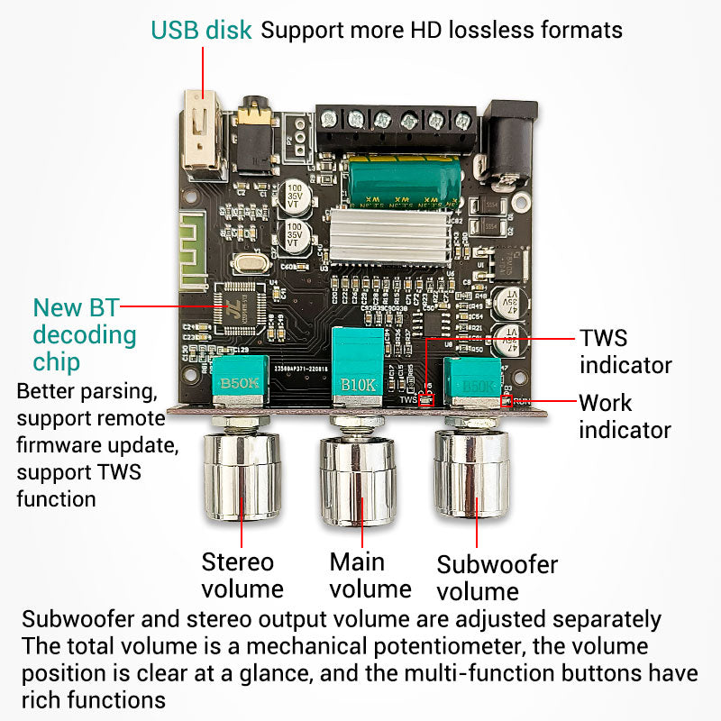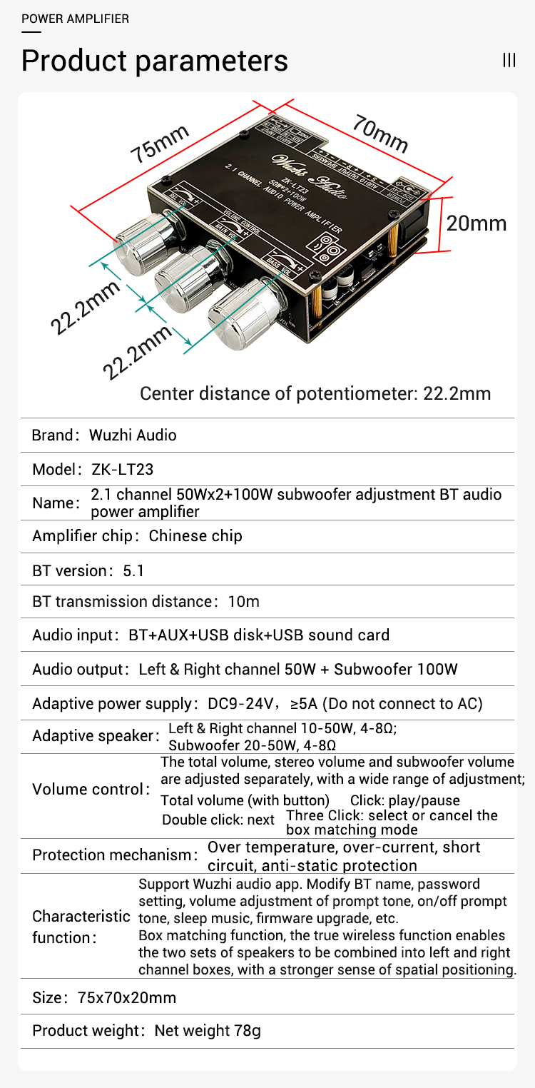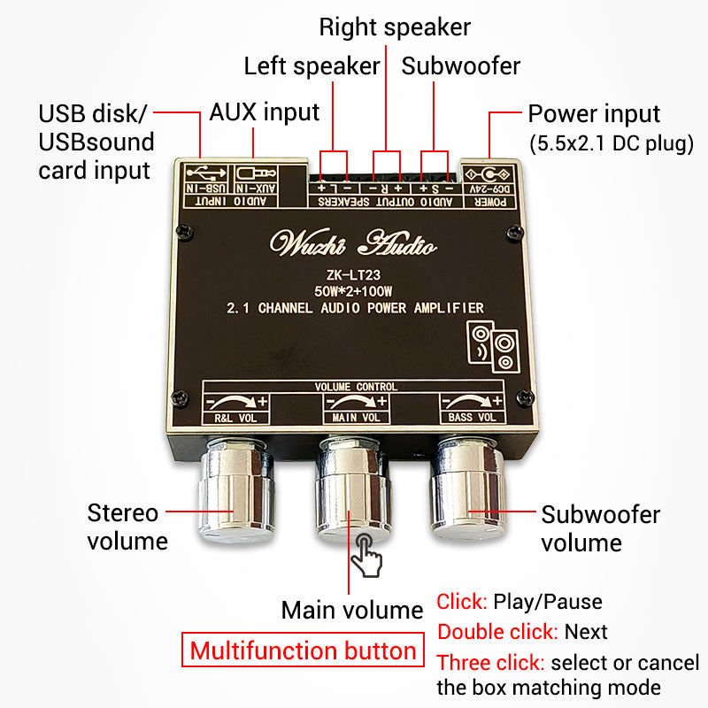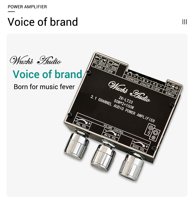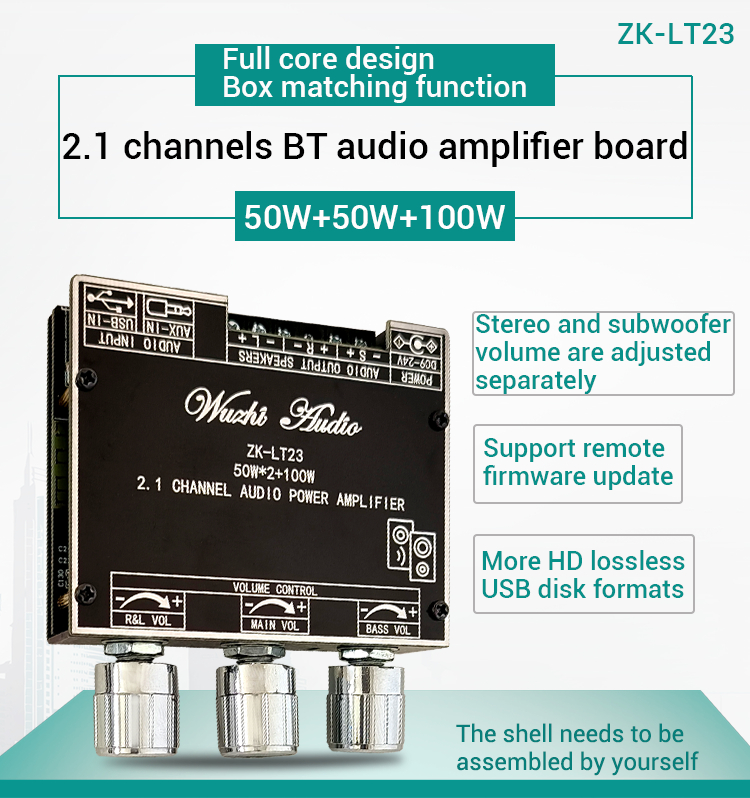 Wuzhi Audio ZK-LT23 2.1 Channel Amplifier Bluetooth Amplifier Module 50W+50W+100W Power Amp TWS