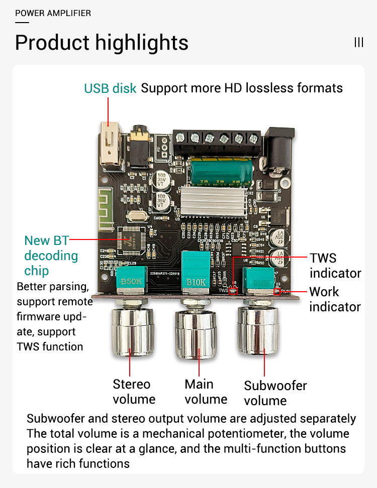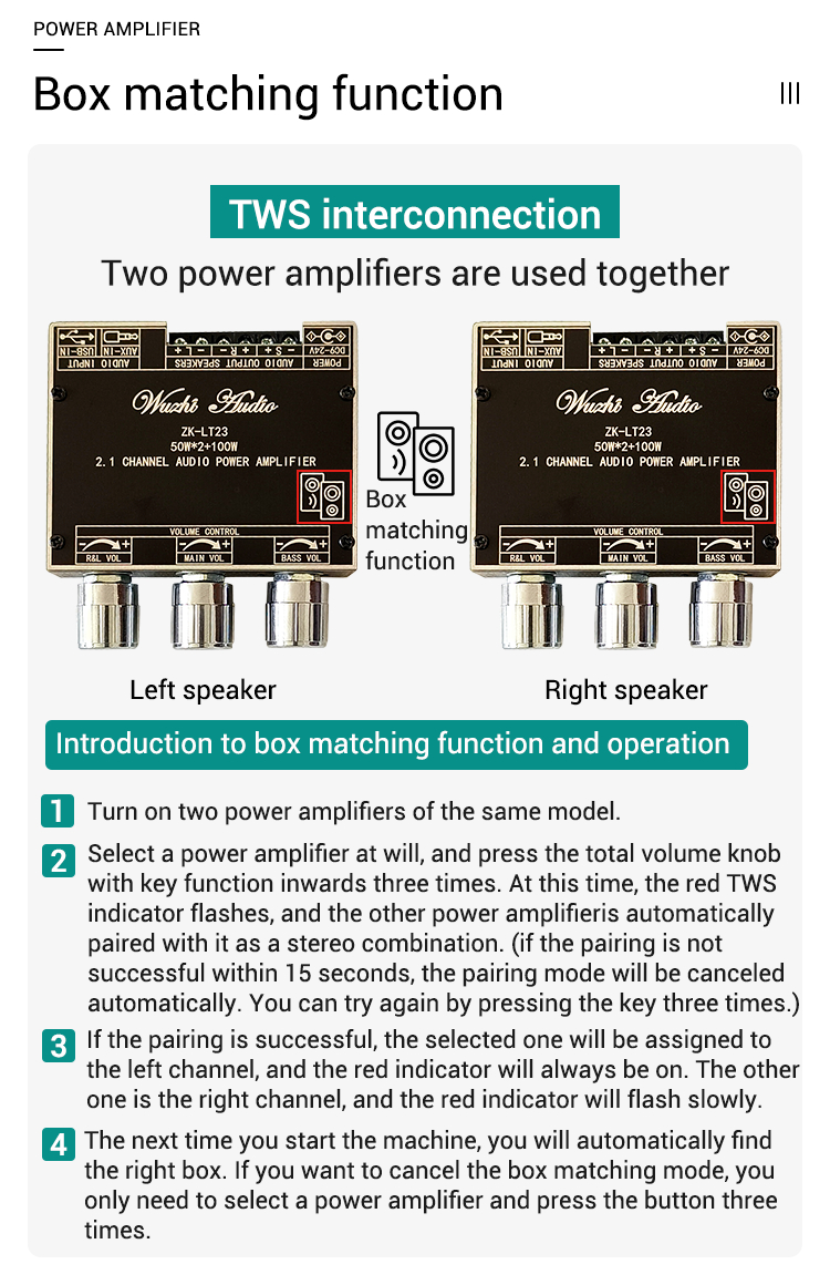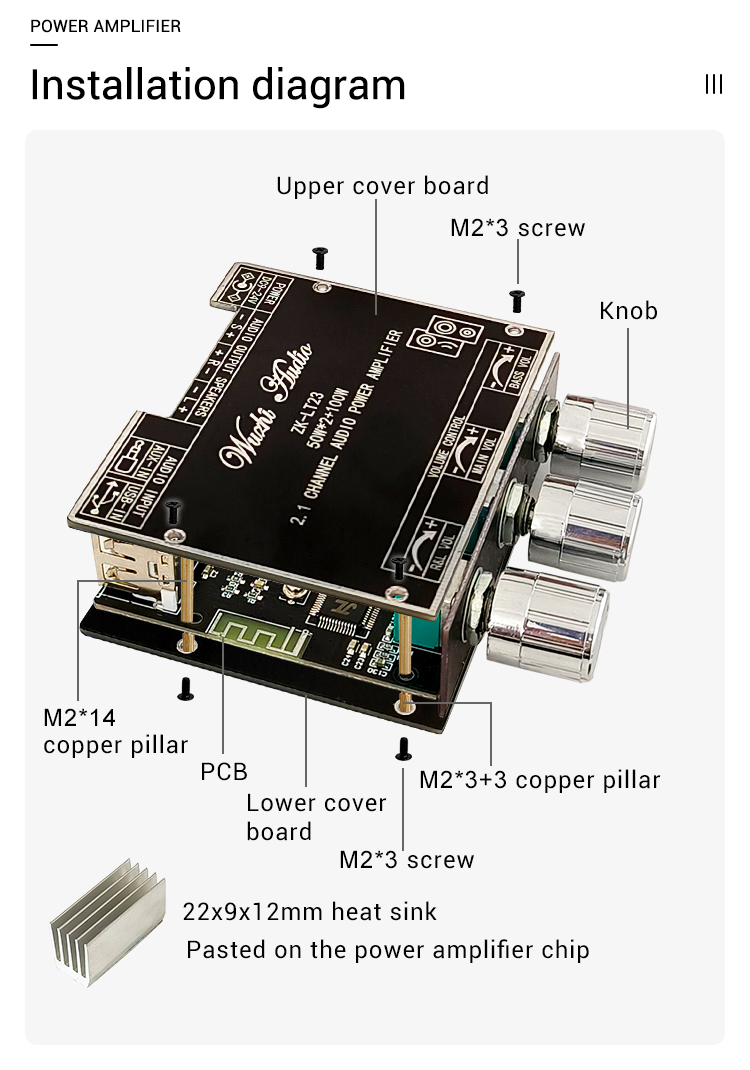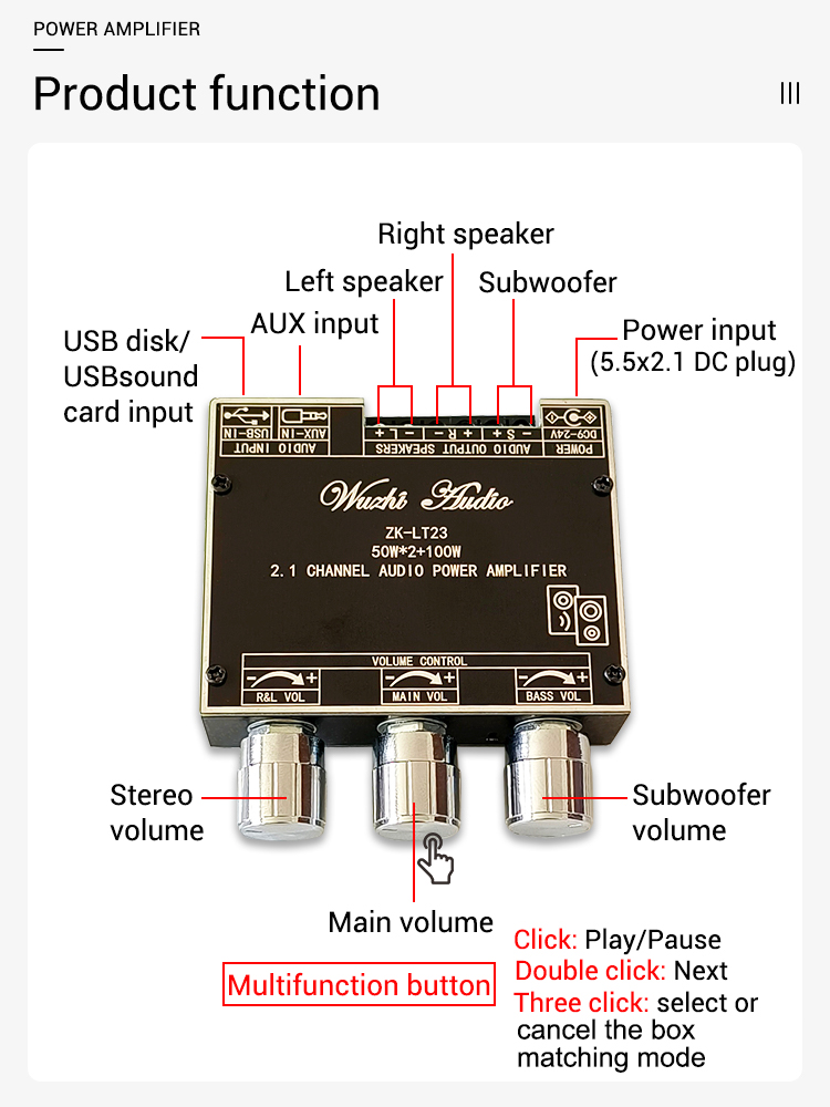 Wuzhi Audio ZK-LT23 2.1 Channel Amplifier Bluetooth Amplifier Module 50W+50W+100W Power Amp TWS