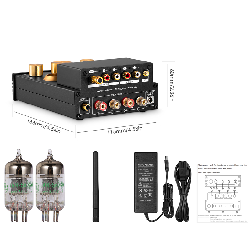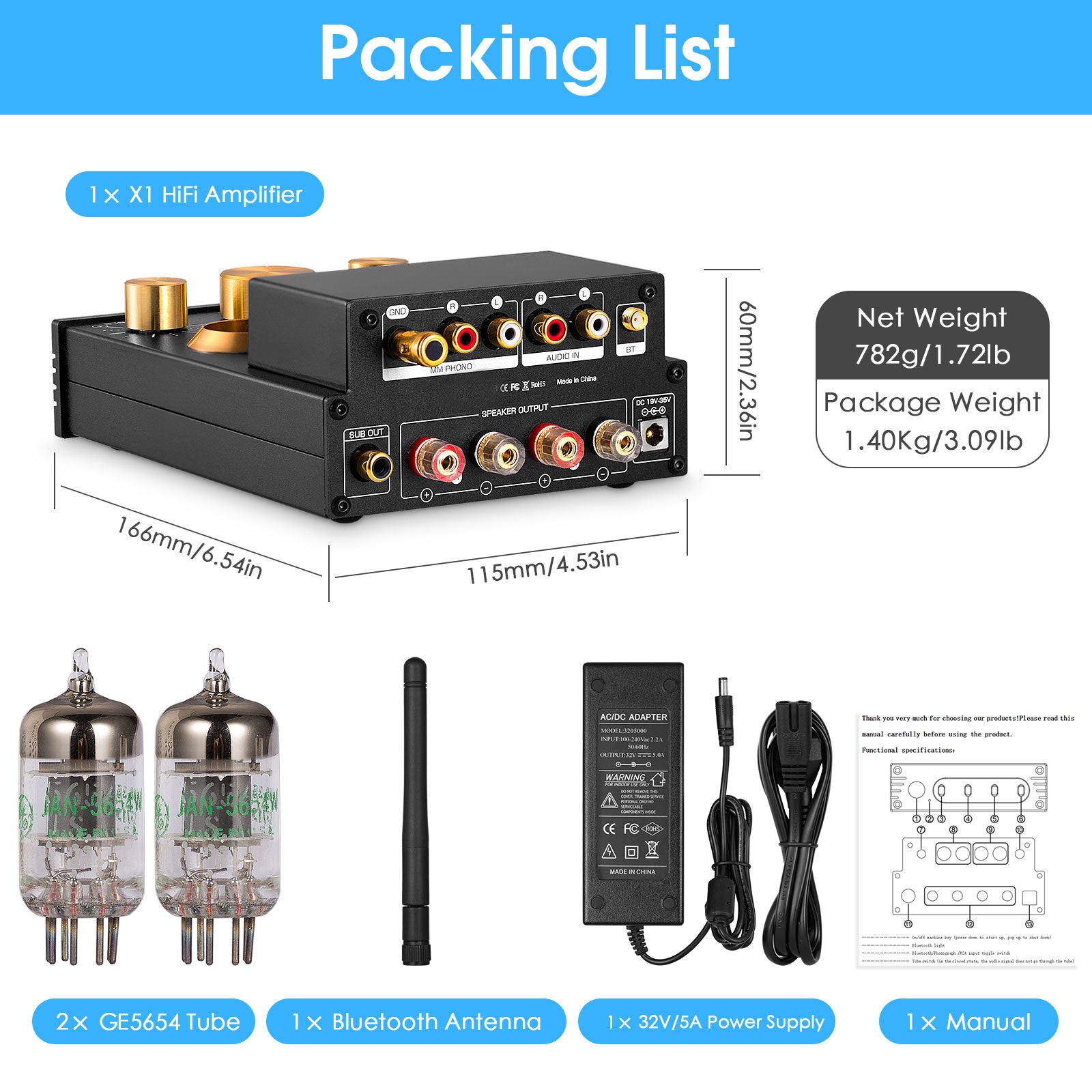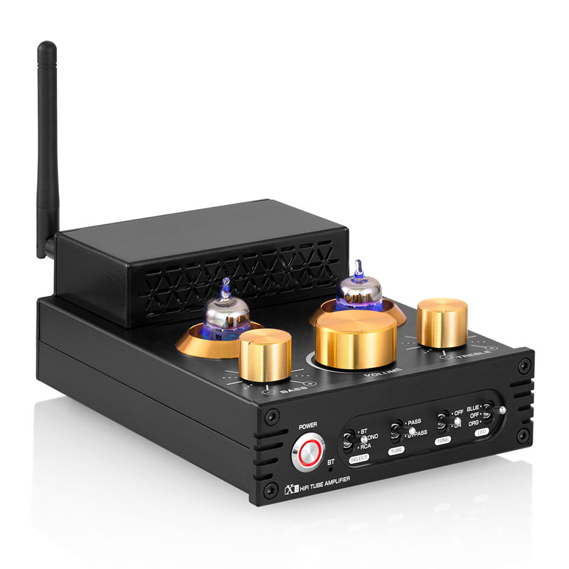 X1 tube power amplifier is the fully upgrading version in all aspects, using GE5654 vacuum tube to improve sound quality, TDA7498E amp IC that can output 160W+160W to drive all home speakers, integrating the function of phono preamp and amplifier to support MM phono turntables input, and adding a low frequency output that can connect active subwoofer to build 2.1 channel audio system.