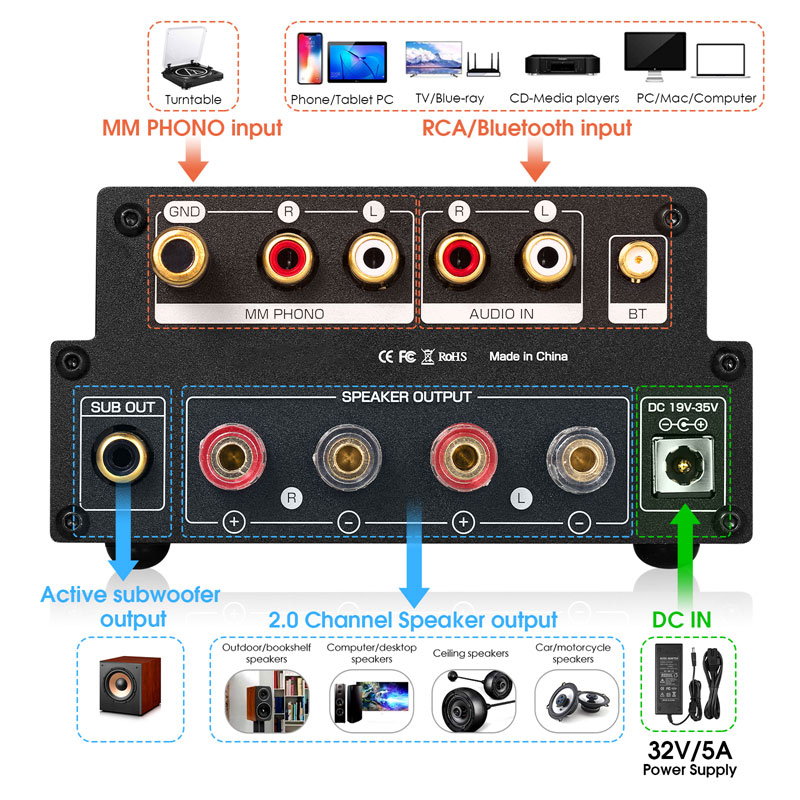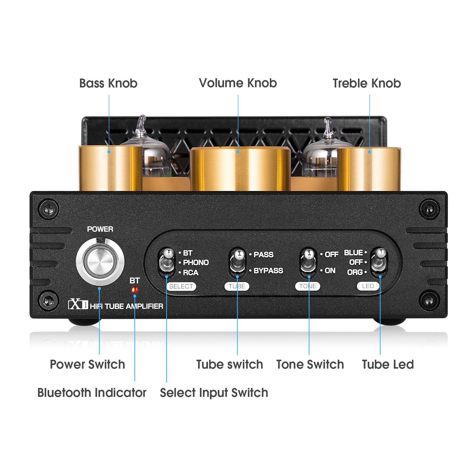 - Bluetooth 5.0 & Stereo RCA & MM Phono inputs: Can be used as tube amp or MM phono amp, and input signal can be losslessly switched via input selection, perfectly compatible with most audio device such as phone, computer, TV, CD player, DAC, MM phonograph and so on