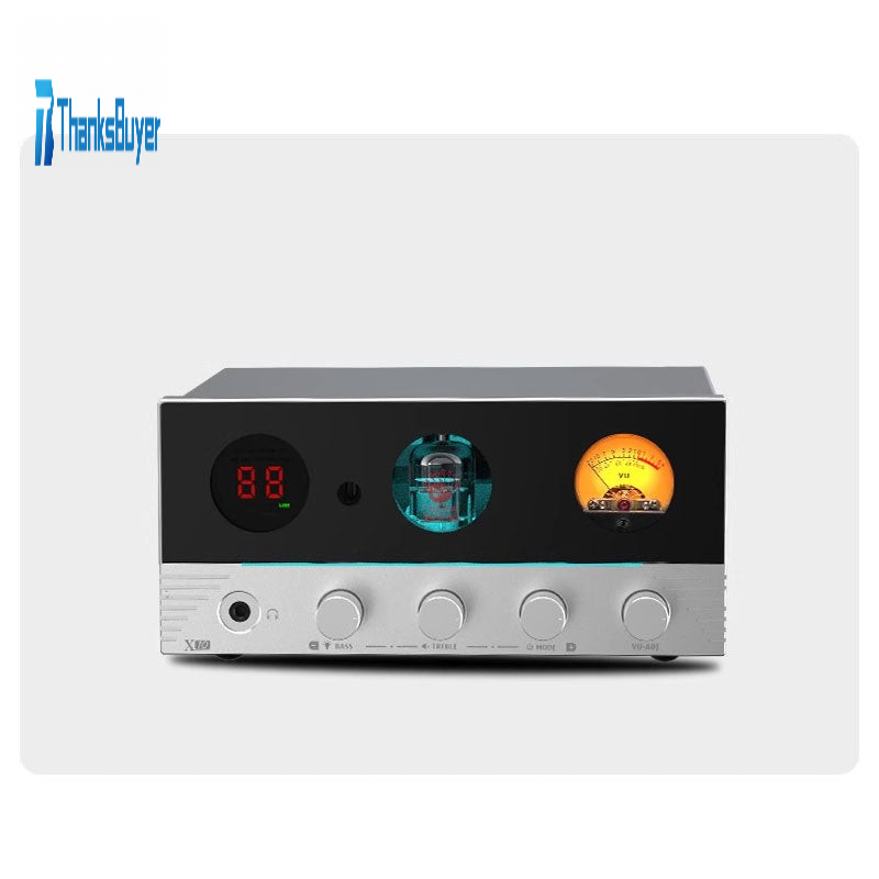 - X10 is a multifunctional product that integrates decoding, front-end, headphone amplifier, and power amplifier, showcasing the delicacy and professionalism of the product, ensuring visual harmony and consistency. It is equipped with the ECC83 electronic tubes, digital screen, and retro VU watch, presenting a beautiful and coordinated visual effect.