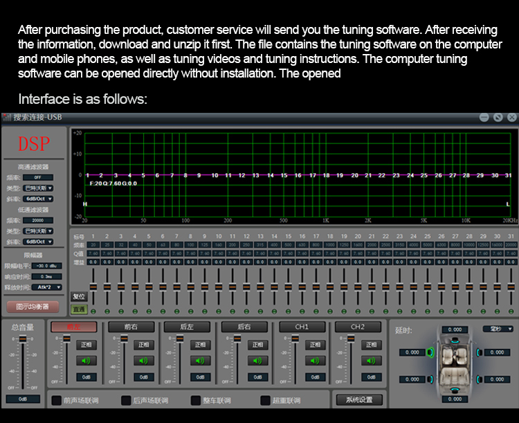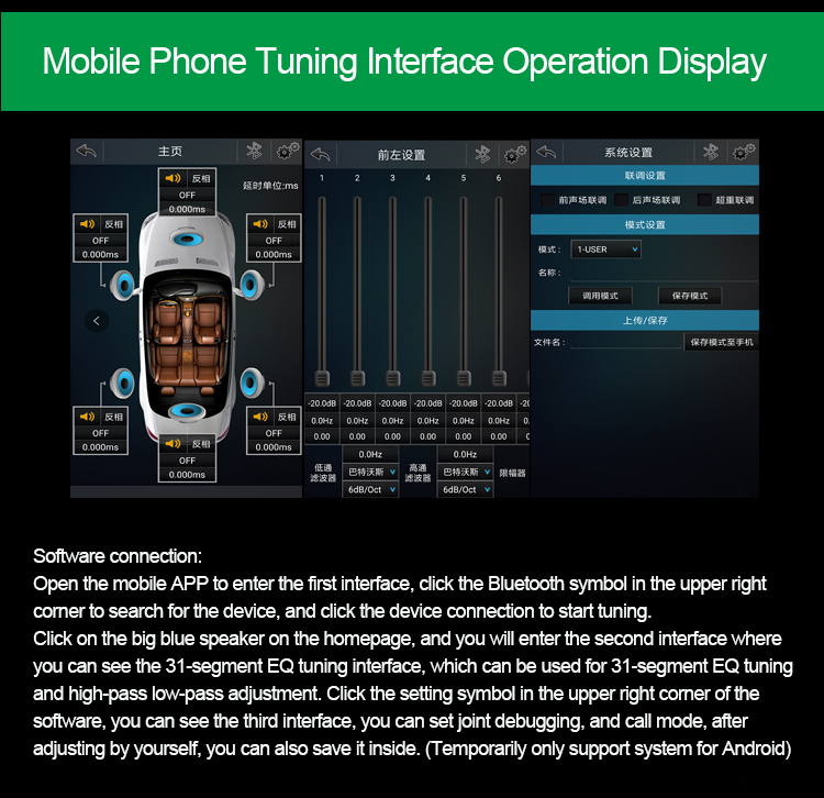 - 31 segments of precise tuning by phone and computer. 31-segment EQ, supports 31-segment tuning, delay adjustment, sound field adjustment and phase adjustment for mobile phones and computers.