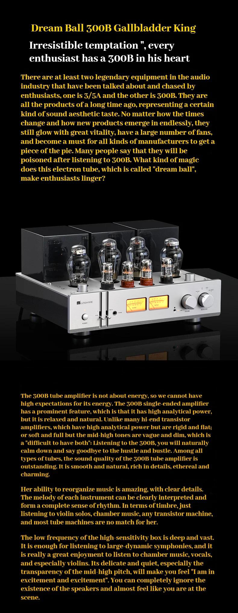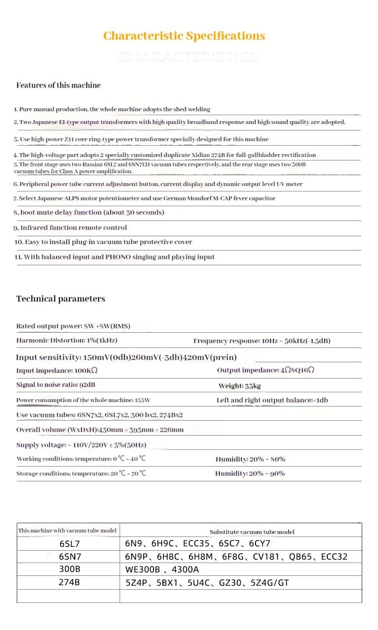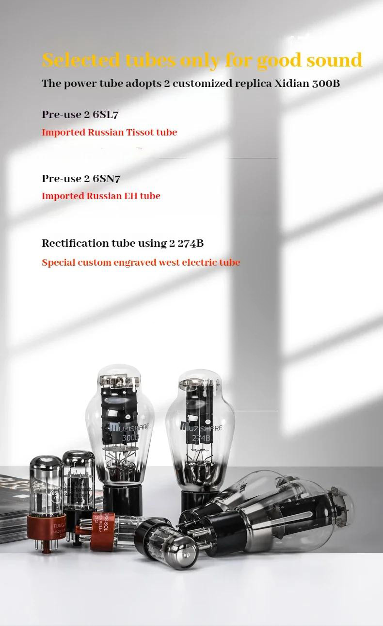 - The front stage uses two Russian 6SL7 and 6SN7EH vacuum tubes respectively, and the rear stage uses two 300B vacuum tubes for class A power amplification.