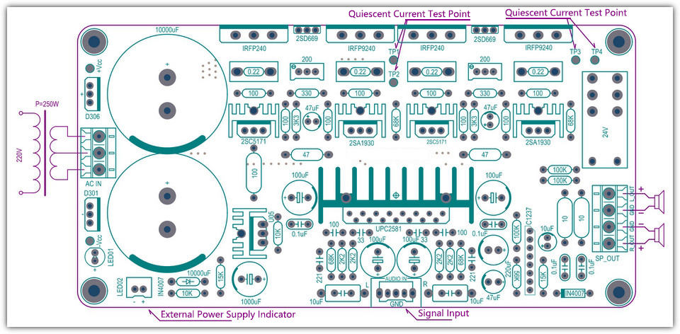- Final current amplifier adopts A1943/C5200 or IRFP9240/IRFP240 paired transistors