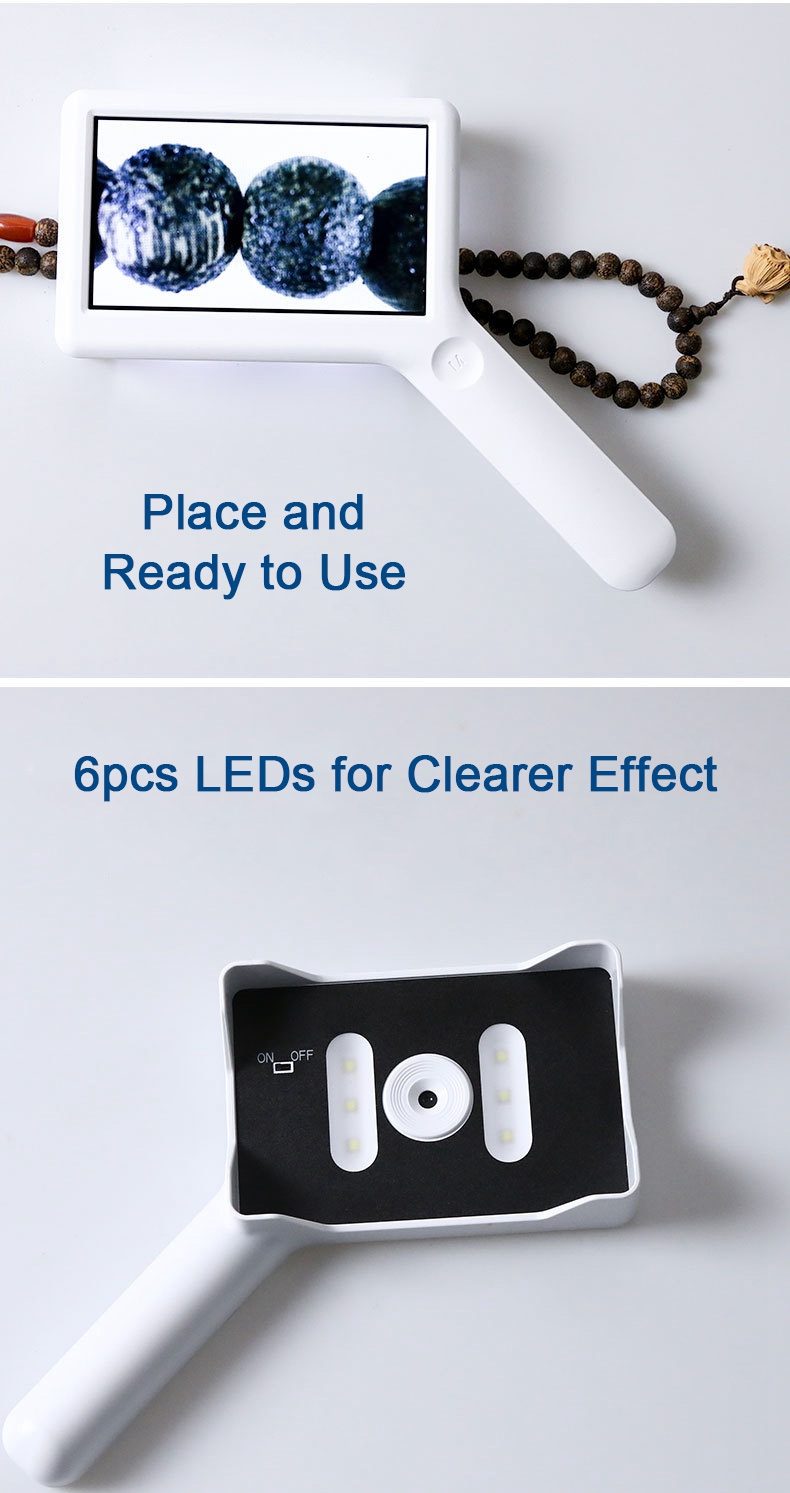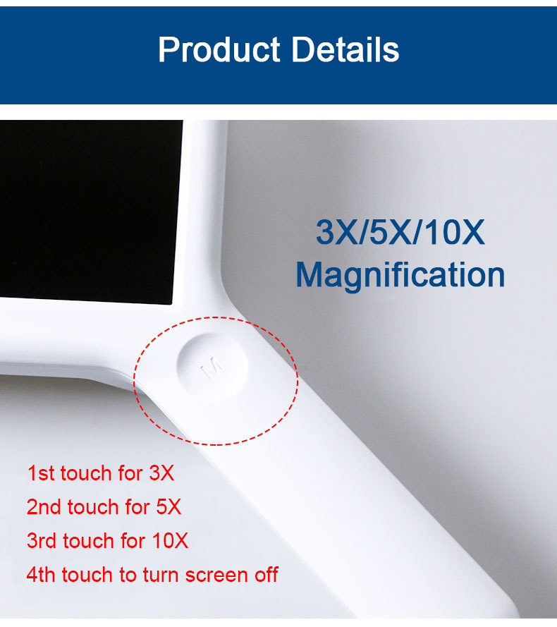 - 6 LED lights enable clearer magnification effect. The light is uniform and not dazzling, providing sufficient brightness as required