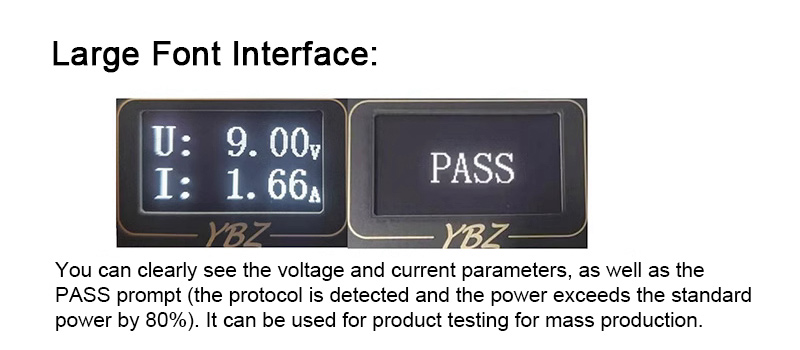 - Large font interface: You can clearly see the voltage and current parameters, as well as the PASS prompt (the protocol is detected and the power exceeds the standard power by 80%). It can be used for product testing for mass production