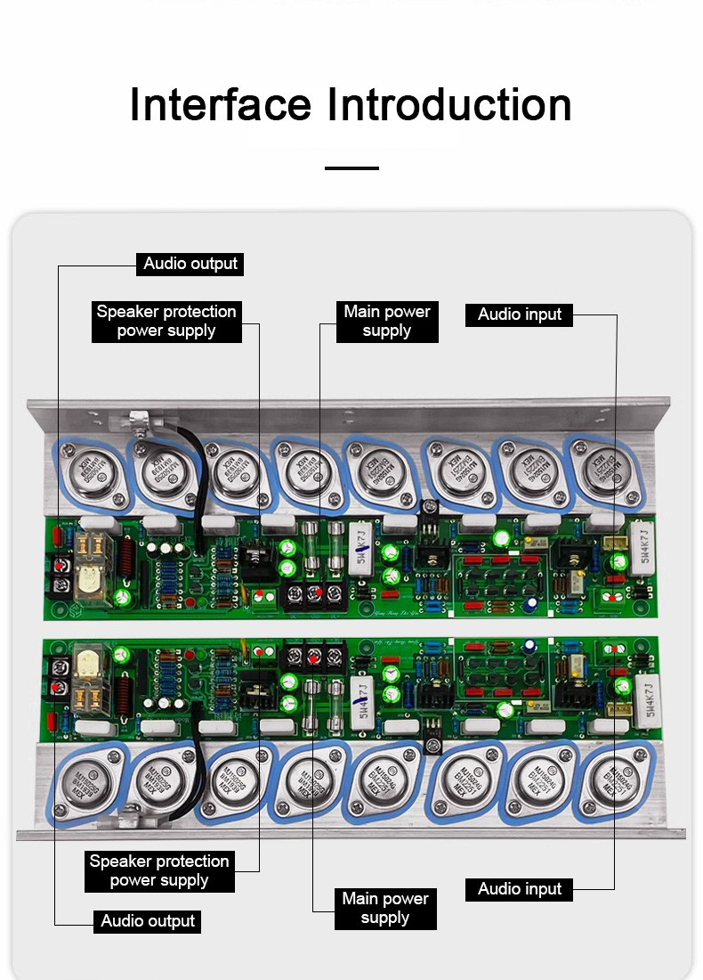 - Imported chip circuit is used for speakers. The amplifier board can be used for a longer time and better protect speakers, with delay, DC, overload, over-current and output short-circuit protection.