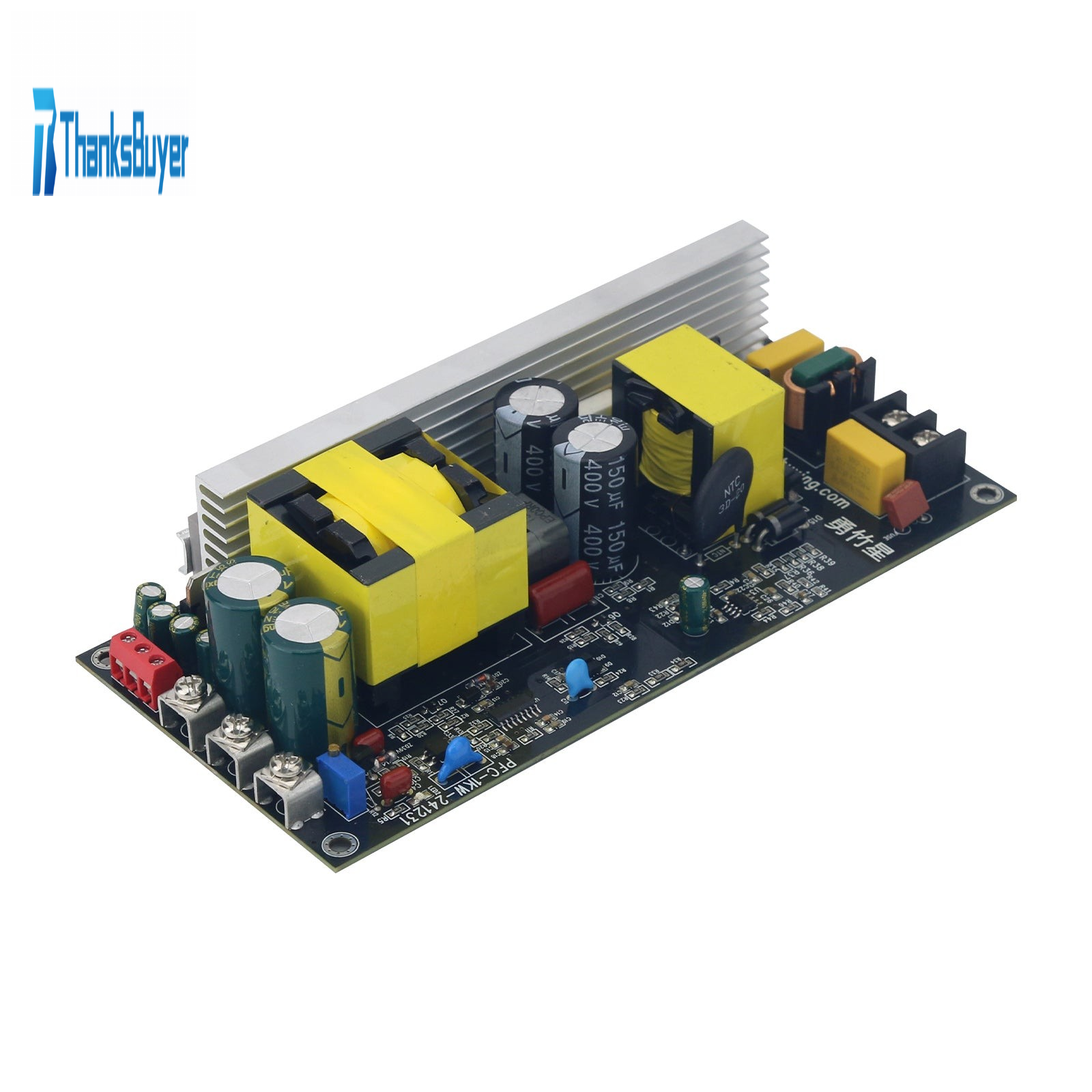 - The LLC control board and PFC part each use a small board independently, and the components face outward, which is convenient for testing voltage or waveform, and also convenient for maintenance and debugging. PFC part's bridge stack, switch tube, rectifier diode use a door shaped radiator, which is convenient for users to install a 40x40mm/1.6x1.6" fan when used in continuous load applications. DC~DC part adopts solid aluminum heat sink 10mm/0.4" in thickness, and the heat sink tube faces outward for easy disassembly. It is equipped with an 85°C temperature control switch in the middle. When the heat sink temperature exceeds 85°C, the board will turn off the chip output.
