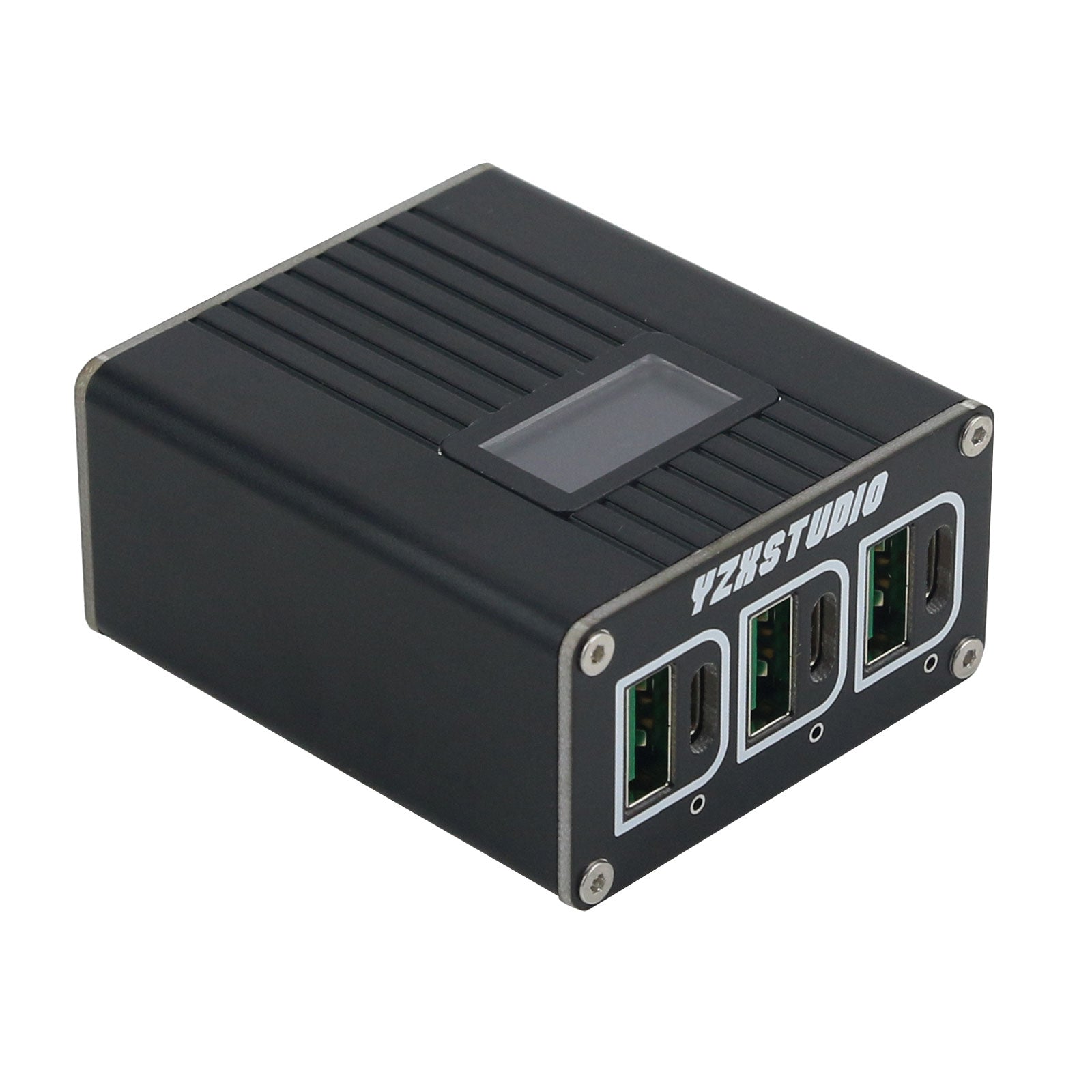 - The main interface displays input voltage and motherboard temperature, and the lower 3 boxes display voltage, current, power and protocol of each channel.