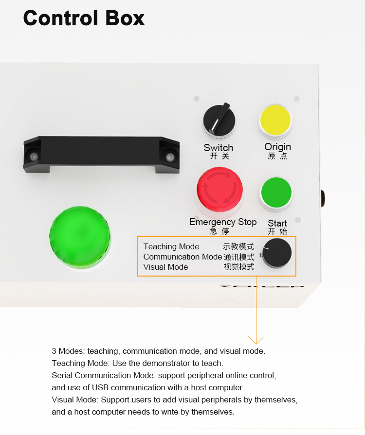 This robot arm is also equipped with a demonstrator, which is easy to operate. It supports manual teaching and drag teaching. Supports three user formulas and 50-step programmable numbers, and the maximum load of the robotic arm can reach 2KG/4.4LB.