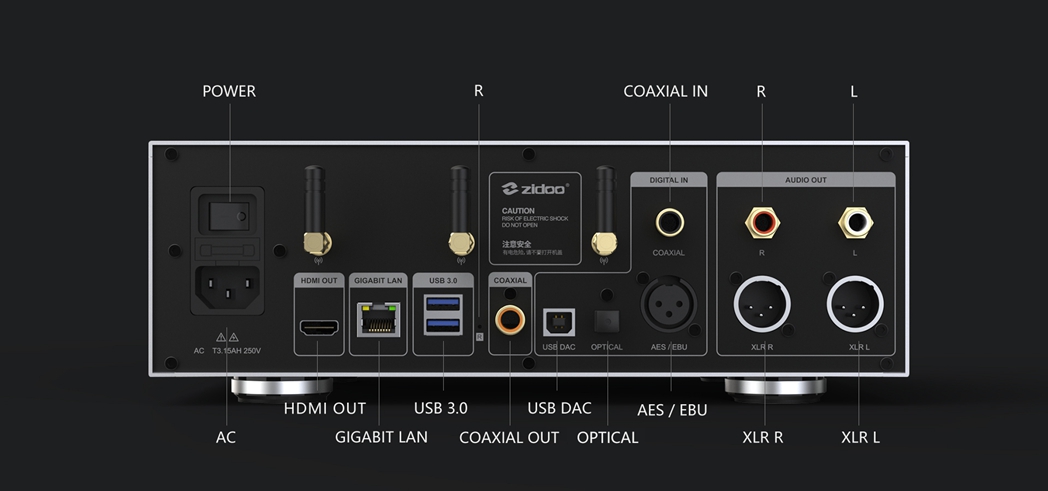 - Built in with SSD, dual ES9068 DAC, dual digital/analog power supply modules and toroidal power supply.
