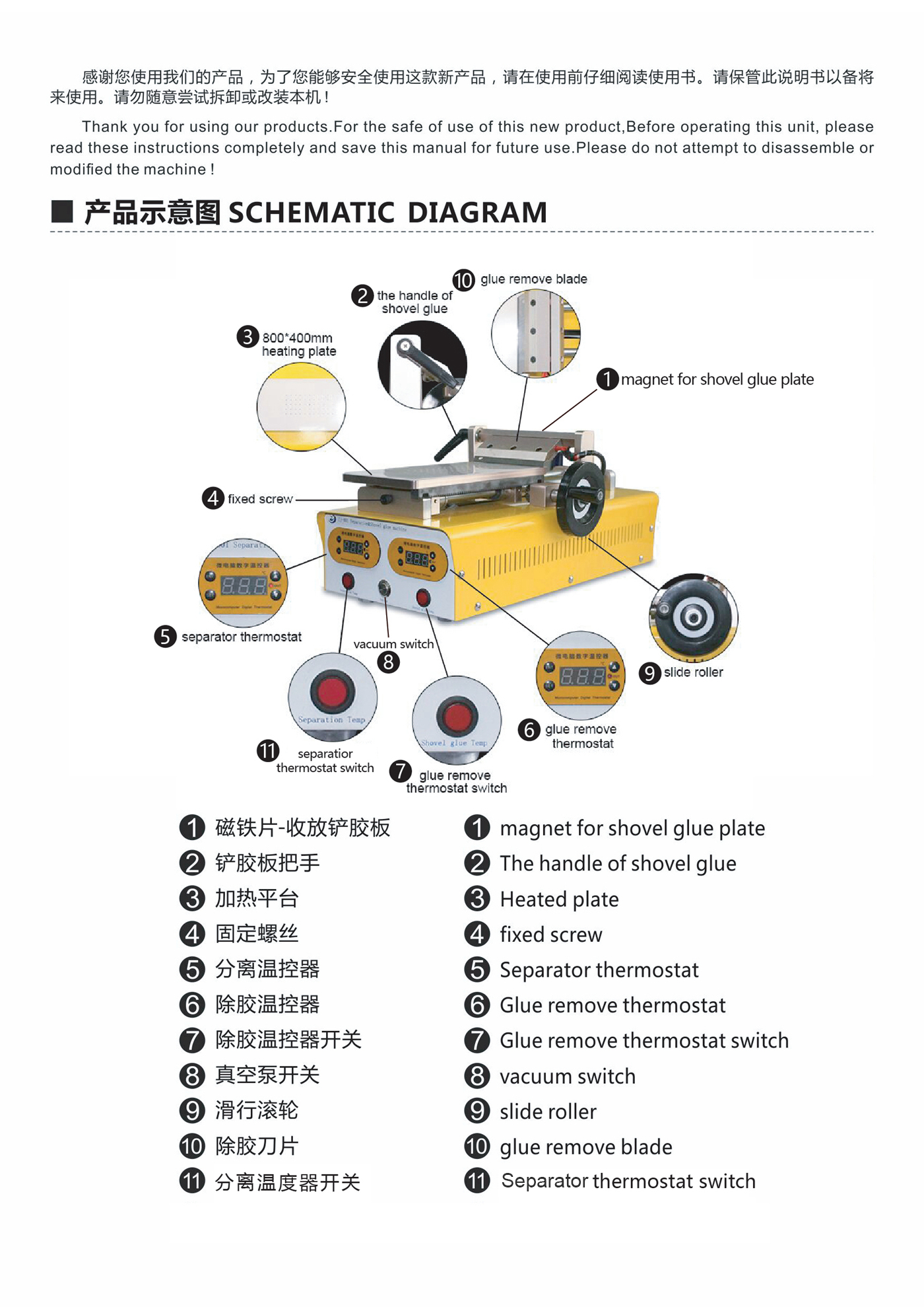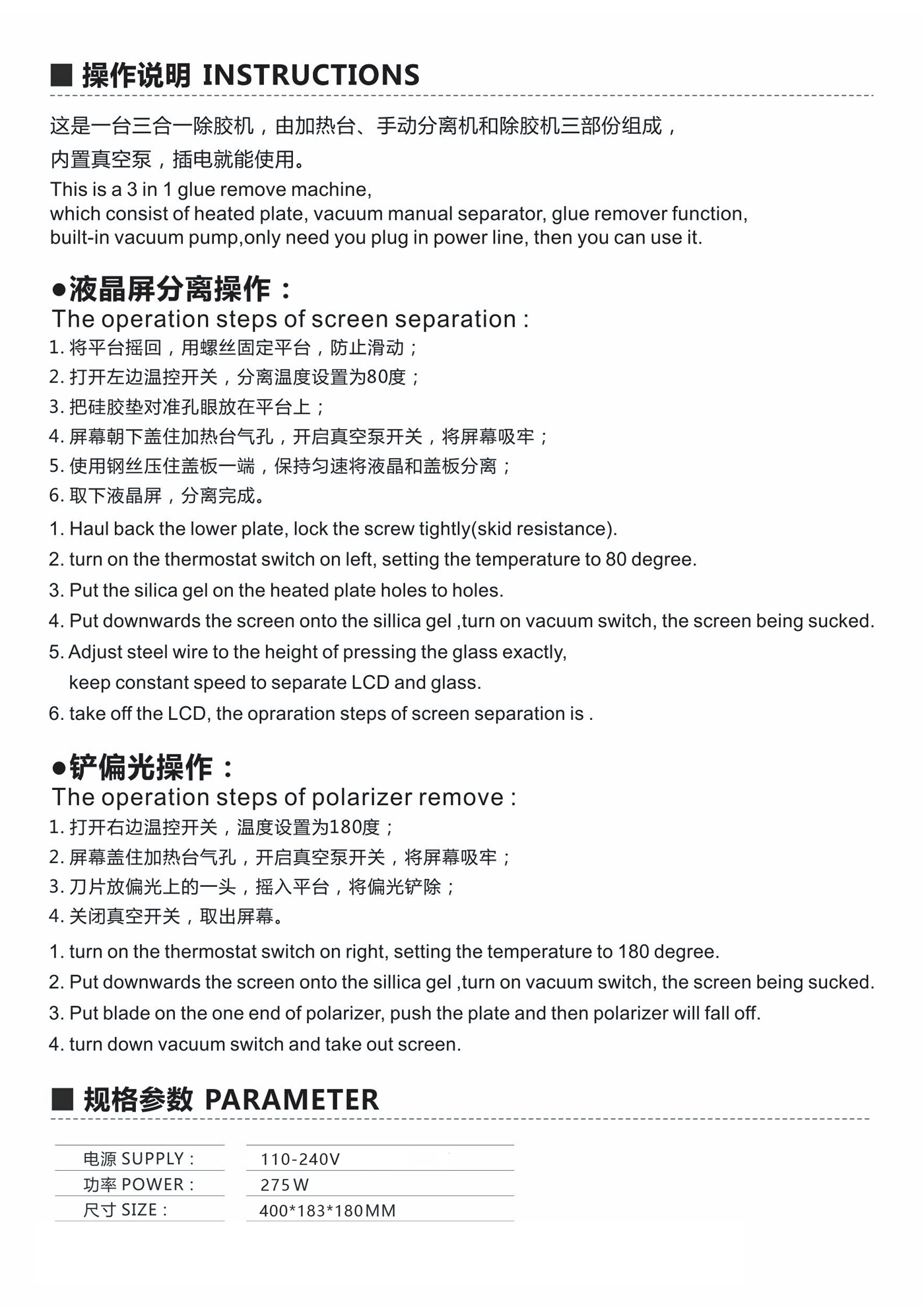 The new type of glue remover supports all straight-screen mobile phones with a maximum size of 7 inches. It can support screen separation and screen glue remove. Built-in vacuum pump, with slider roller, easy to operate, accurate control. It can greatly increase the success rate of glue removal.