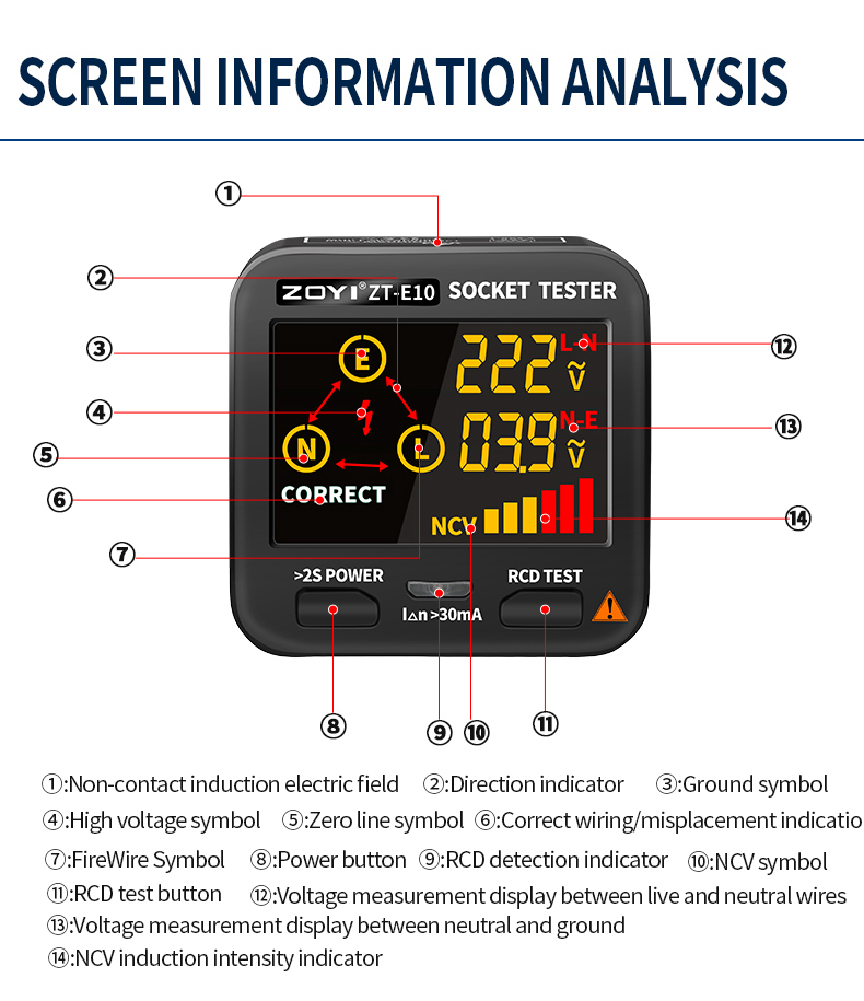 ZOYI ZT-E10 Socket Tester Smart Electric Socket Tester (UK Plug) Ground Zero Line NCV Test