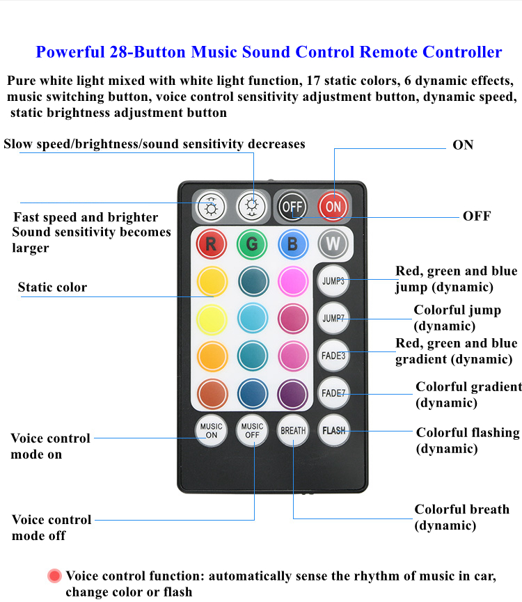 - Powerful 28-button music sound control remote controller