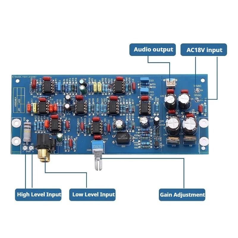 - The professionally designed subwoofer filter front-end board uses a full eight dual operational amplifiers to perform multiple filtering on the audio input, effectively removing vocals and providing you with a clean and rich low-frequency experience. The output part is dynamically amplified, resulting in a cleaner and more efficient overall effect, with a large and powerful dynamic. The operational amplifier circuit uses a ±15V power supply to ensure that the output level of the operational amplifier is sufficiently high. Equipped with NE5532 operational amplifier as standard, other operational amplifiers can be upgraded by oneself in the later stage, with high playability.