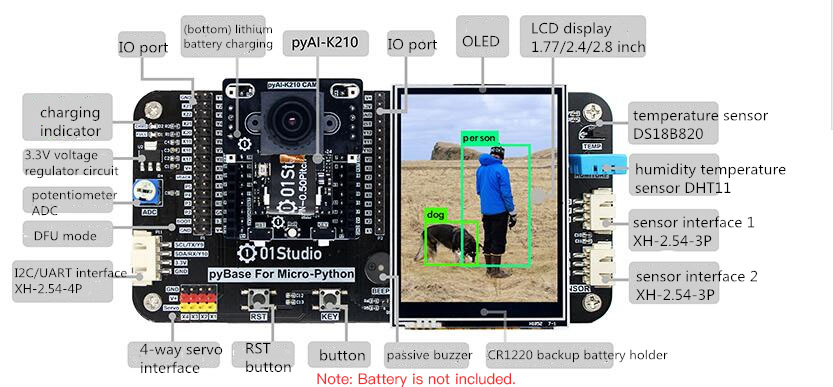 pyBase is a bottom board designed by 01 Studio for pyAI-K210. pyBase has rich on-board resources while designing peripheral interfaces, which is very extensible. Micro-Python basic development kit consists of pyAI-K210, pyBase, LCD display, this kit can realize more Micro-Python experiments, the following is a detailed function description: