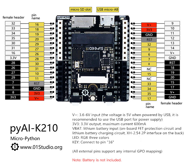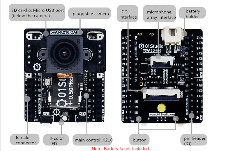 pyAI-K210 is a development board designed and developed by 01 Studio, based on Jianan Technology edge computing chip K210 (RSIC-V architecture, 64-bit dual-core) solution. Its interface is compatible with Micro-Python pyBoard.