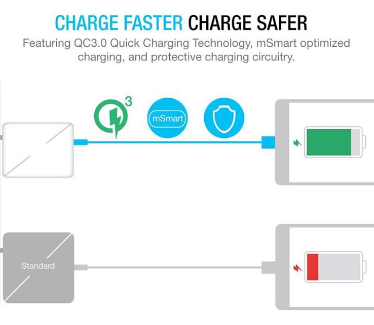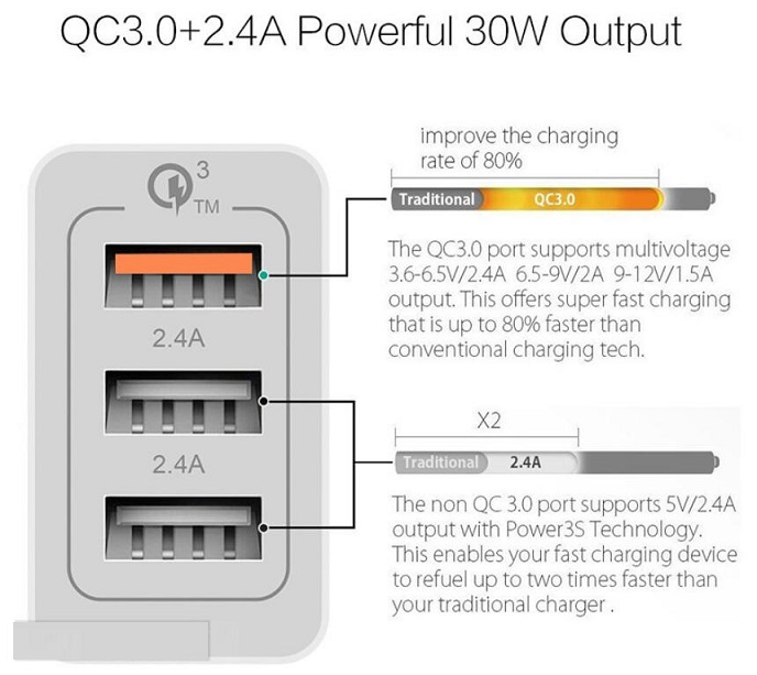 - QC3.0 output:3.6V-6.5V/3A;6.5V-9V/2A;9V-12V/1.5A.