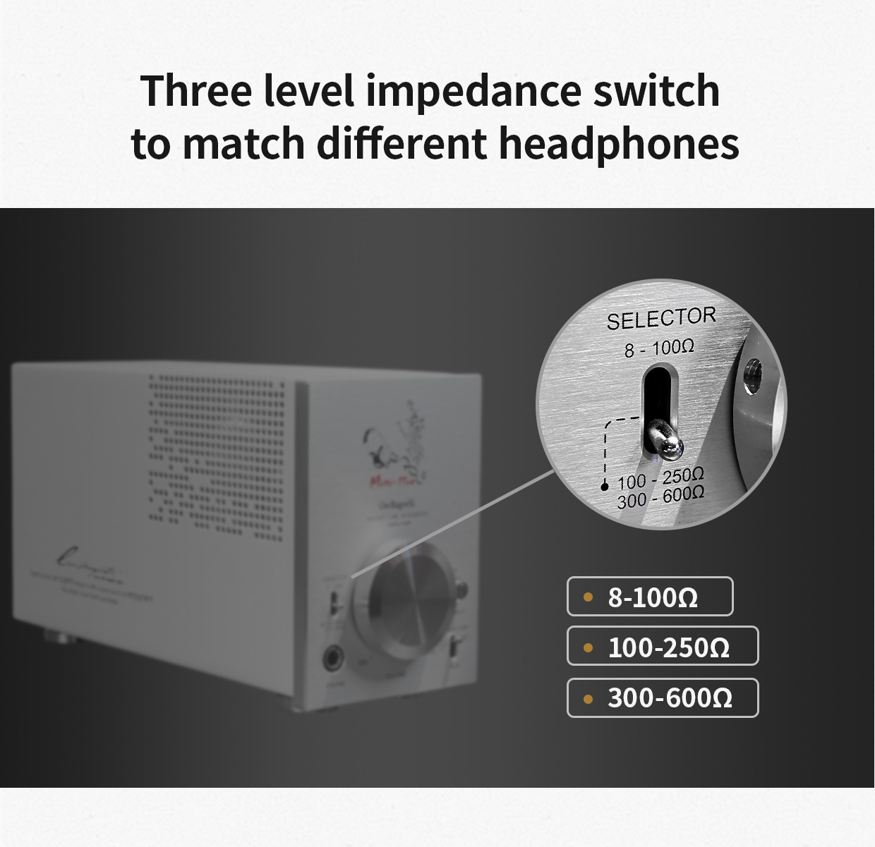 - Output impedance: 8ohms for speaker, 8-100ohms/100-250ohms/300-600ohms for headphone