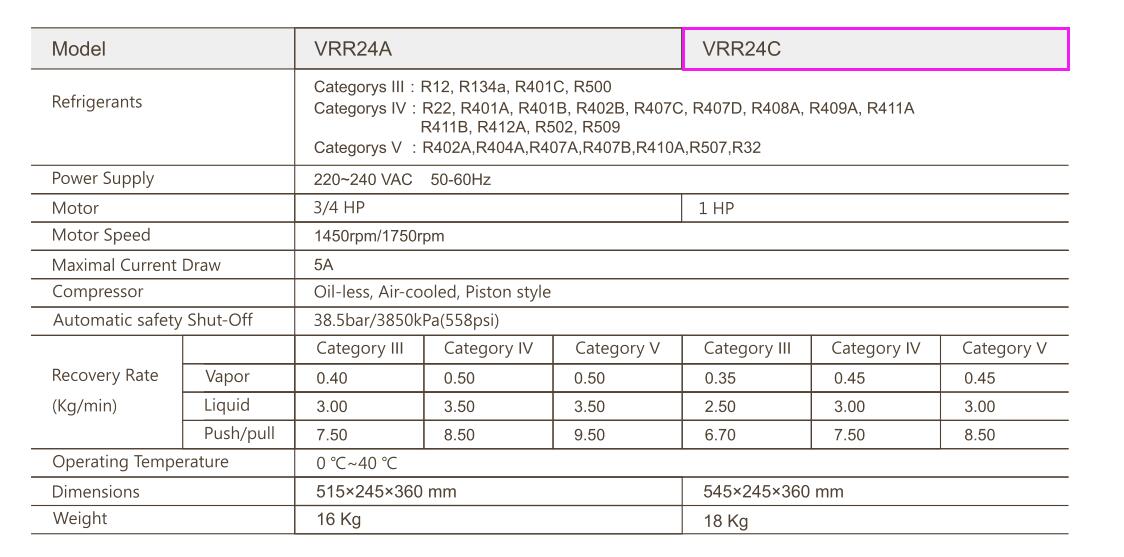 - Oil-less compressor, recovers all commonly used CFC, HFC,HCFC refrigerants including R410A