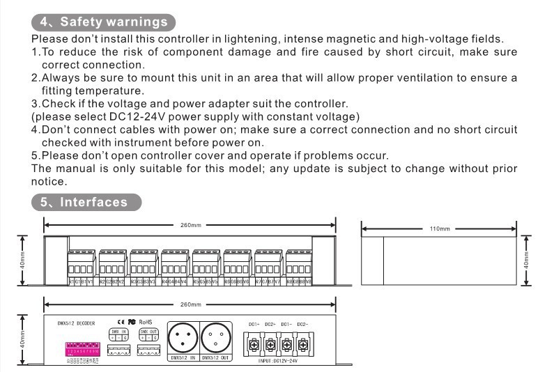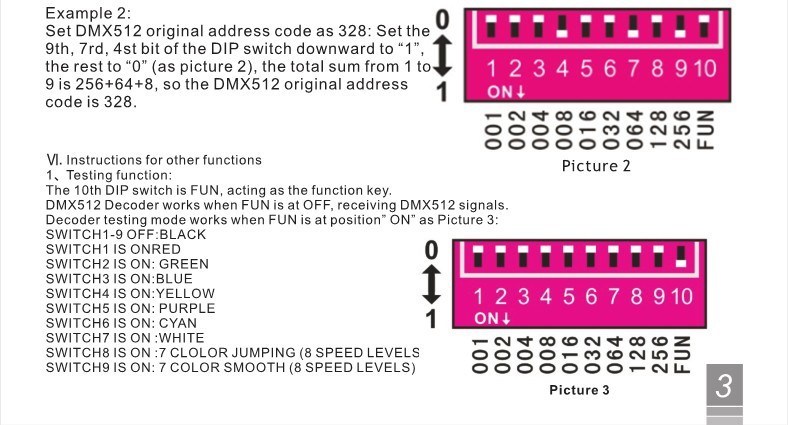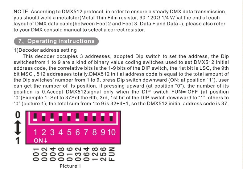 - Universal standard DMX512 input protocol; addresses can be set up by DIP switch.