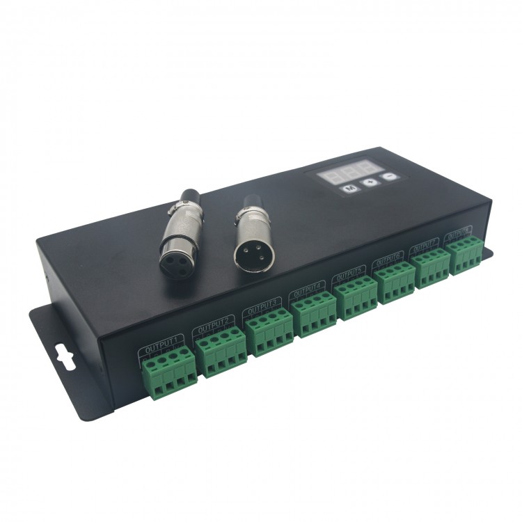 24CH RGB DMX decoding driver works to convert universal DMX512/1990 digital signal to PWM signal, which controlled by DMX512 console, with 256 levels grey scale output per channel. Adopting unique programming technology, Creating exclamatory, perfect color fade & smooth effect, simultaneously let LED color more affluent.