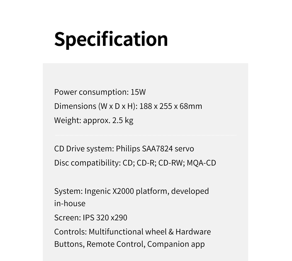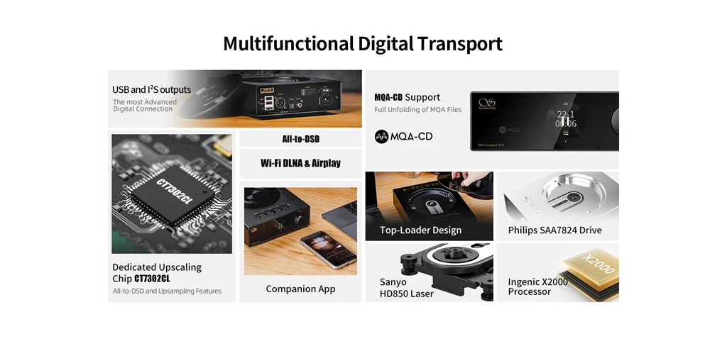 - Wired output: USB, I²S, optical fiber, coaxial, AES/EBU