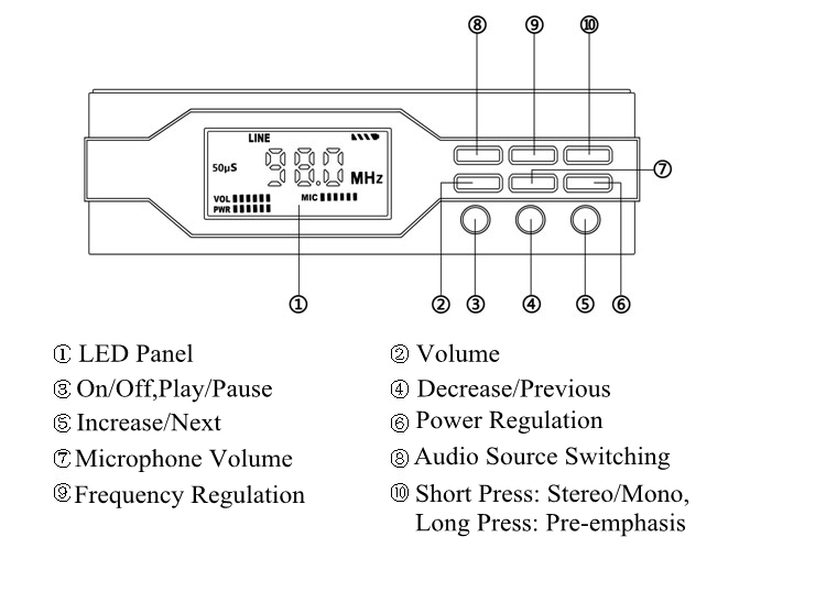 7. Intelligent storage: The transmitter will save the transmitting power and frequency when it is powered off last time