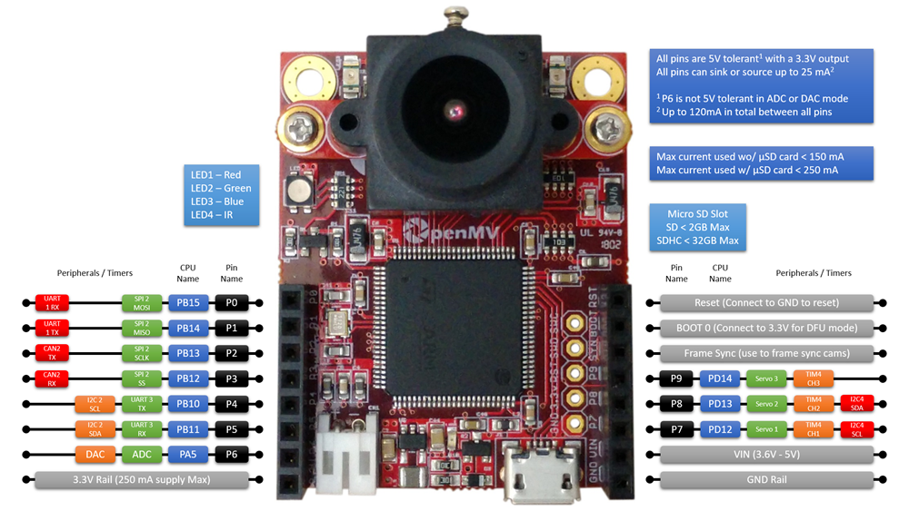 - All pins are 5V tolerant with 3.3V output. All pins can sink or source up to 25mA. P6 is not 5V tolerant in ADC or DAC mode. Up to 120mA may be sinked or sourced in total between all pins. VIN may be between 3.6V and 5V. Do not draw more than 250mA from your OpenMV Cam's 3.3V rail.