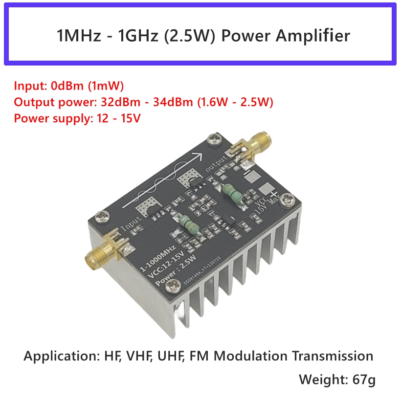 - This broadband RF low-power amplifier is suitable for various wireless transmission applications, such as shortwave FM wireless remote control, FM radio transmission, amateur radio 135-175MHz, 380-470MHz walkie talkies, etc.
