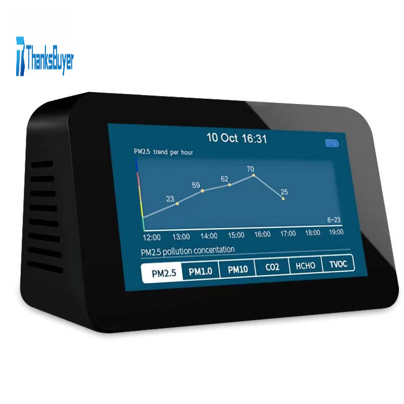- This product is a multifunctional air quality detector that detects Carbon dioxide (CO2), Formaldehyde (HCHO), Total Volatile Organic Compounds (TVOC), Particulate Matter < 2.5 micron-sized particles (PM2.5/1.0/10), Temperature, and Humidity with clock and record function. As a scientific air quality detection device, it combines multiple air sensors with built-in fan to allow real-time monitoring of Carbon dioxide (CO2), formaldehyde (HCHO), total volatile organic compounds (TVOC), PM2.5/1.0/10, temperature, and humidity on its digital LCD display.