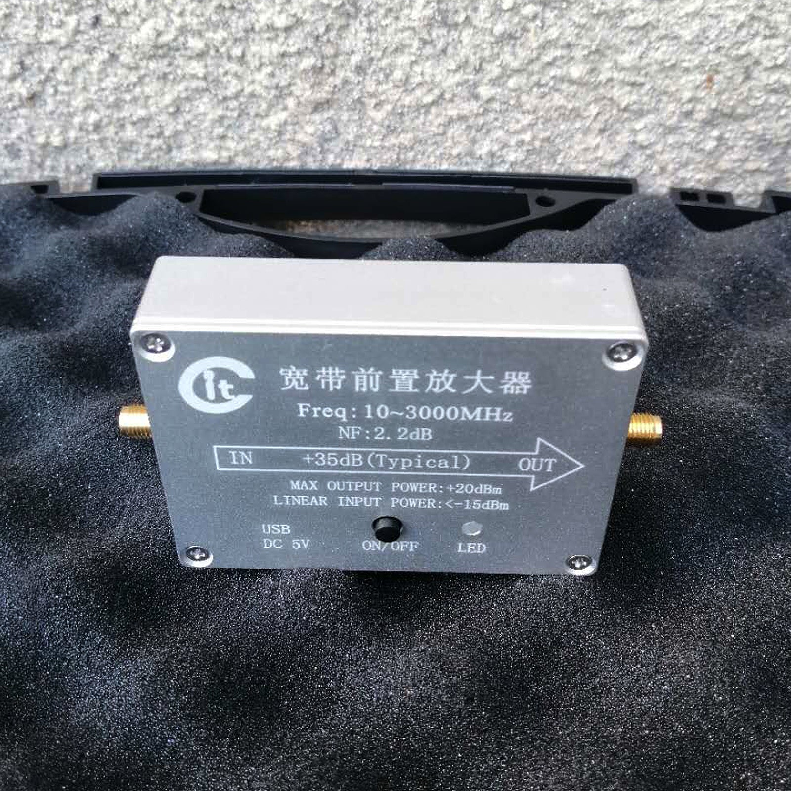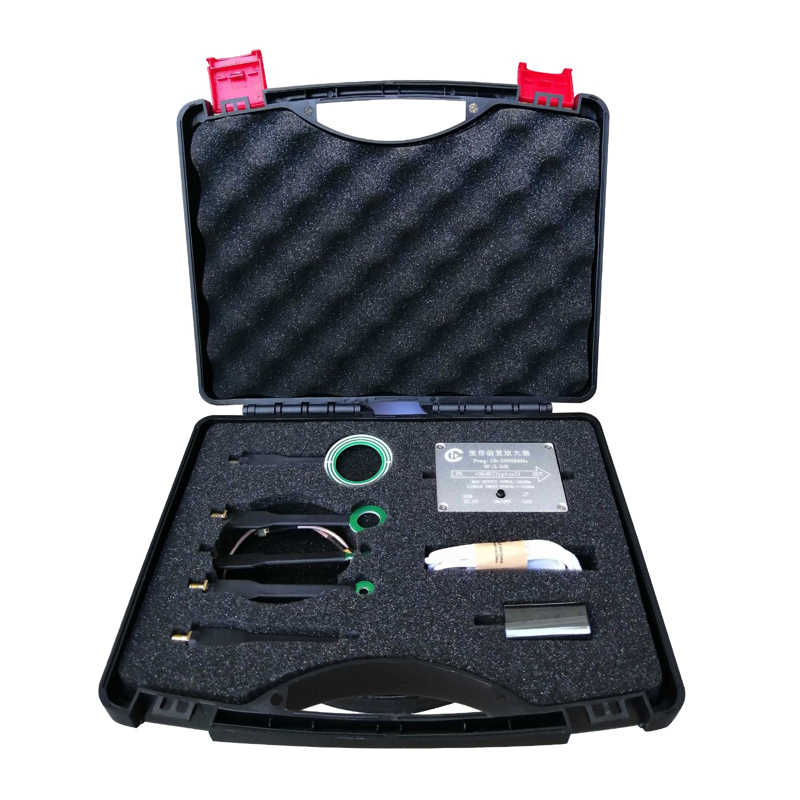Broadband preamplifier, which mainly amplifies the weak signal to be tested. The frequency range of AMP-H module is 100MHz~4GHz, and the gain is about 35dB. The preamplifier contains lithium batteries for easy application, and is equipped with a standard USB adapter for charging.