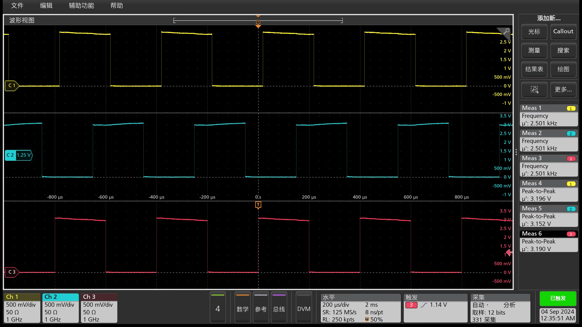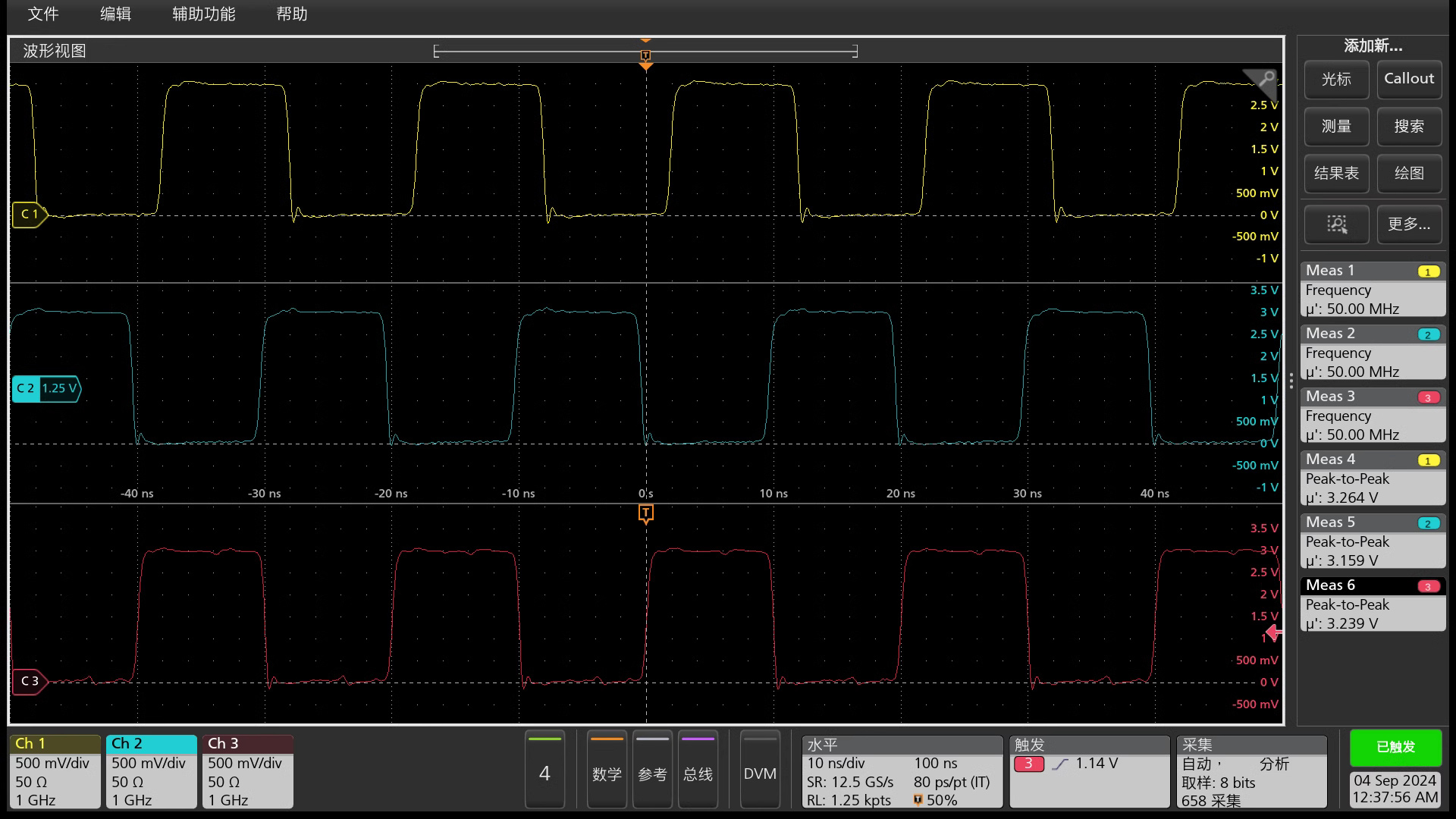 As shown in the figure above, F0 = 50 MHz, division factor DIV1 = DIV2 = 10, F1 = F0/DIV1 = 5 MHz, and F2 = F0/DIV2 = 5 MHz.