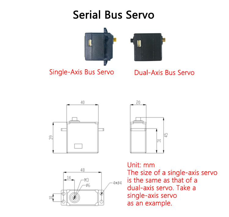 - Serial bus digital servo: High torque, serial bus interface, servo ID recognition, 8 working modes, support angle readback, temperature, voltage feedback, intelligent anti-blocking, complete serial protocol, metal gear, forever free upgrade and support customization. Long life, small vacancy, and large torque. Small dead zone, imported high-precision metal gears