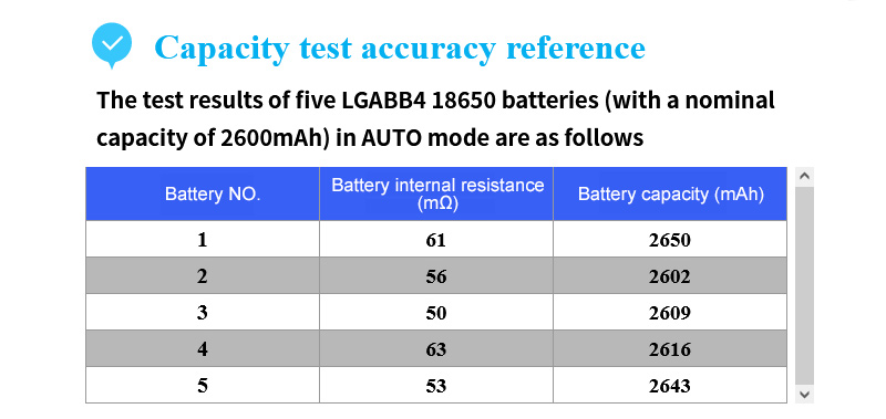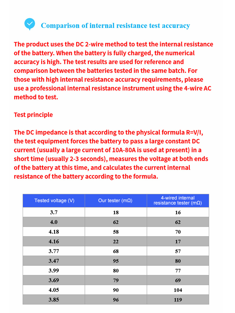 - Internal resistance measurement: supported, using DC two-wire method to test internal resistance