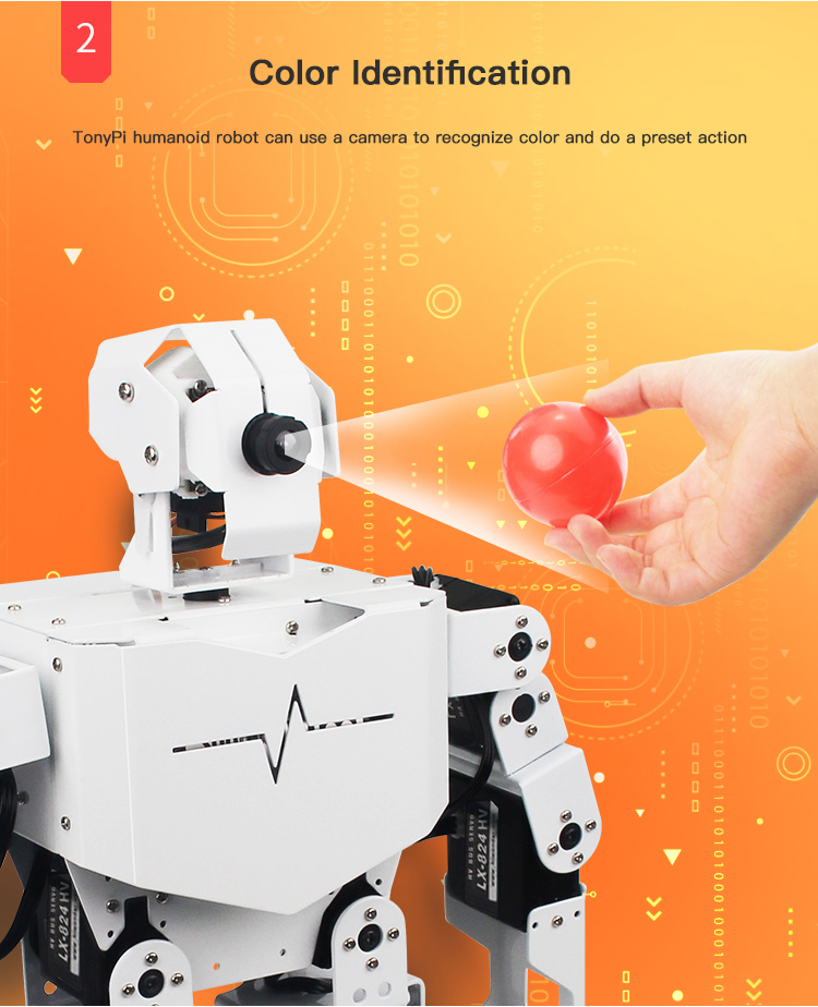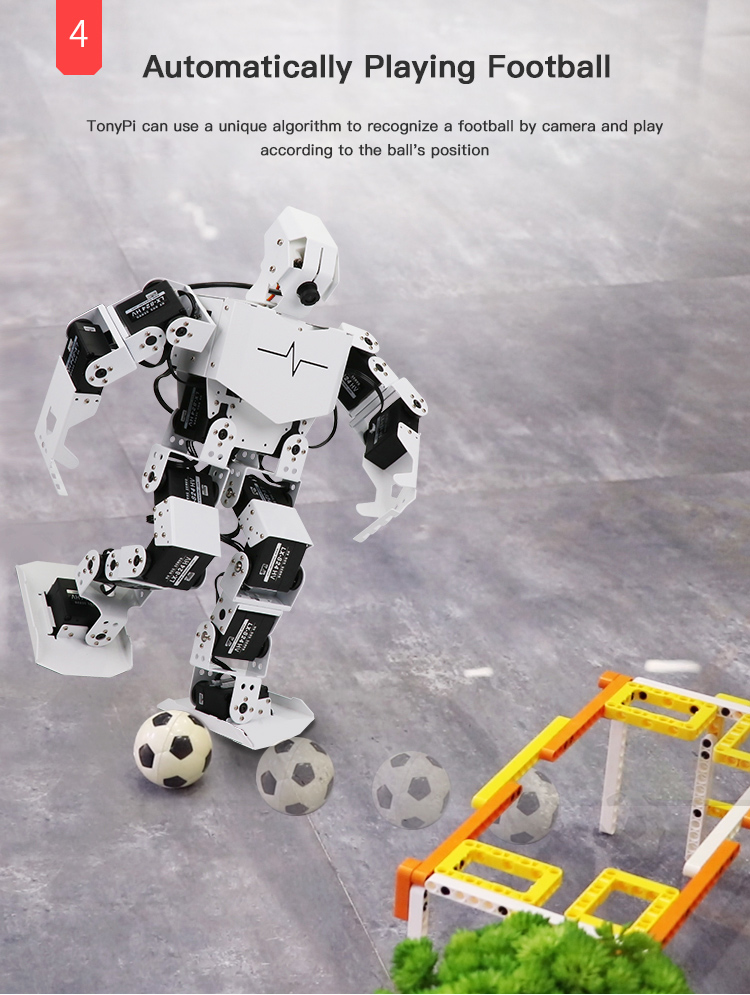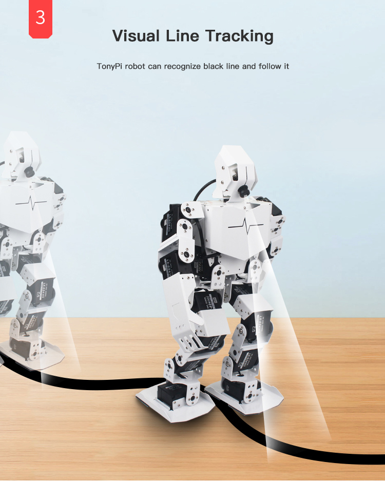 TonyPi intelligent visual humanoid robot uses central controller for Raspberry PI. OpenCV is the image processing library, which uses Python language programming. The robot is equipped with a 2-DOF high-definition camera, which is able to realize Al image identification, colour recognition, playing soccer, visual line following and other gameplay. It equipped with high-voltage bus servo and voltage display. Large capacity significantly increases the working time and built-in action group make it possible for humanoid robot do much complex motion like push-ups.