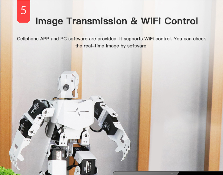 - 18DOF: 2DOF Head + 2DOF Shoulder + 2DOF x 2 Arms + 4DOF x 2 Legs + 1DOF x 2 Feet