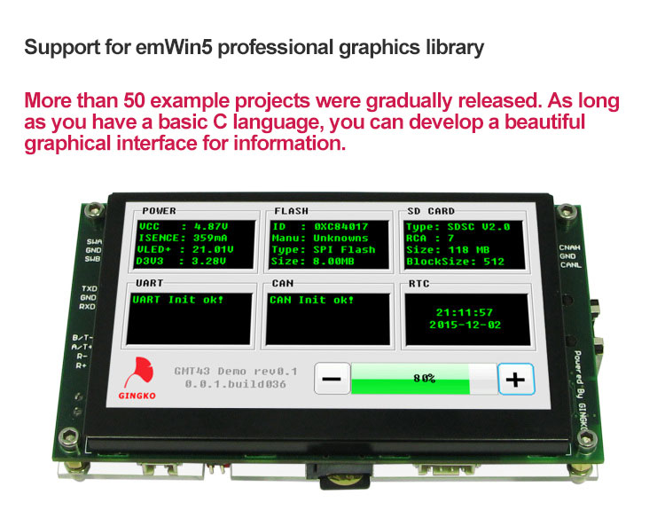 - 4.3-inch true color LCD screen, resolution 480 * 272,65536 color standard touch screen;