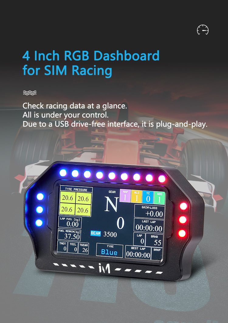 - 4 inch RGB dashboard for SIM racing. You can check racing data at a glance. All is under your control. With a USB drive-free interface, it is plug-and-play