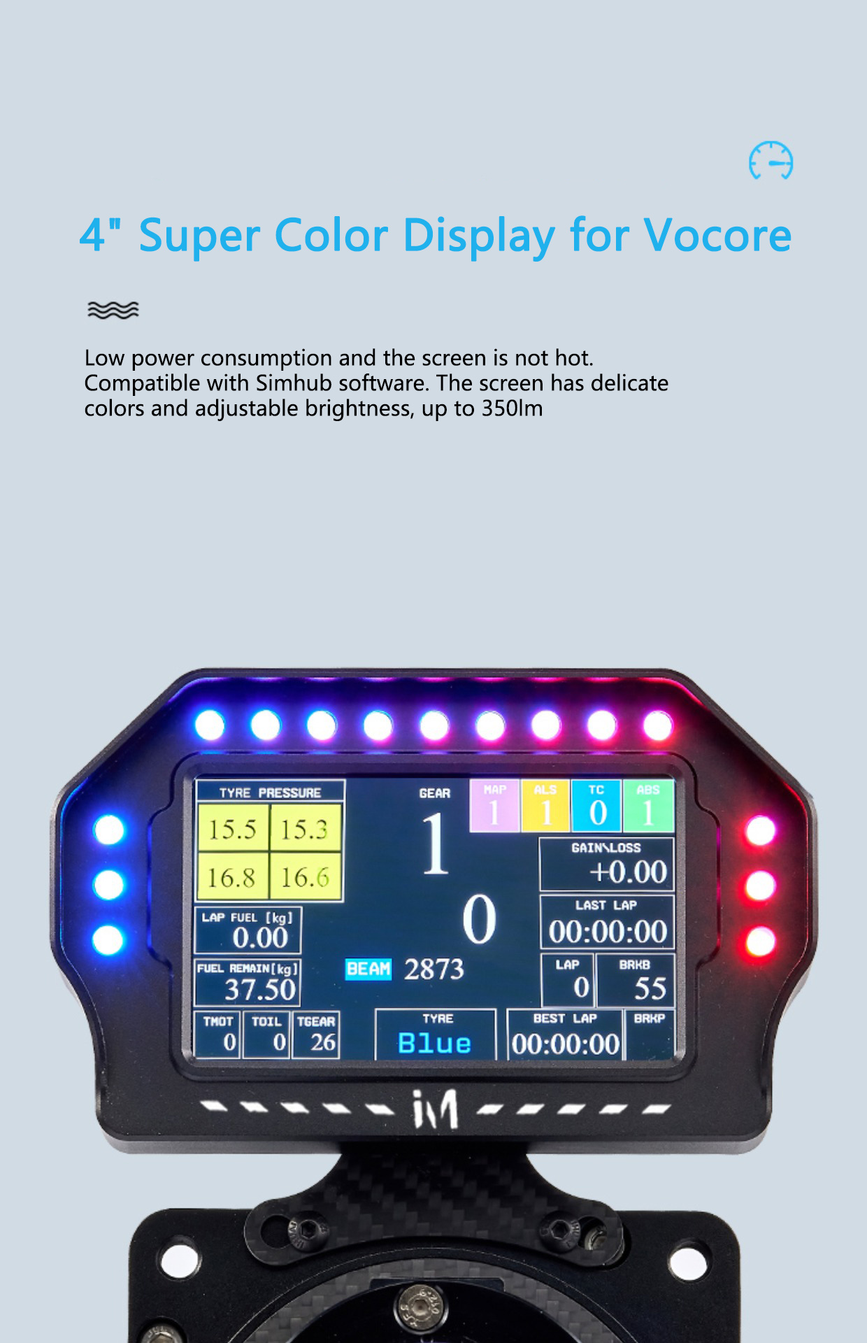 - 4" super color display for Vocore. Low power consumption and the screen is not hot. Compatible with Simhub software. The screen has delicate colors and adjustable brightness, up to 350lm