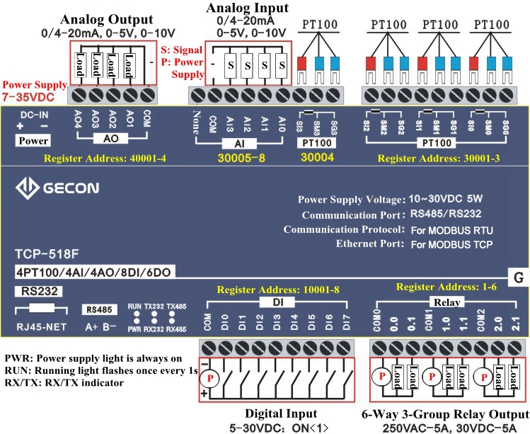 4 PT100 + 4AI + 4AO + 8DI + 6DO Industrial Controller I/O Module TCP-518F [RS485+RS232+Ethernet]