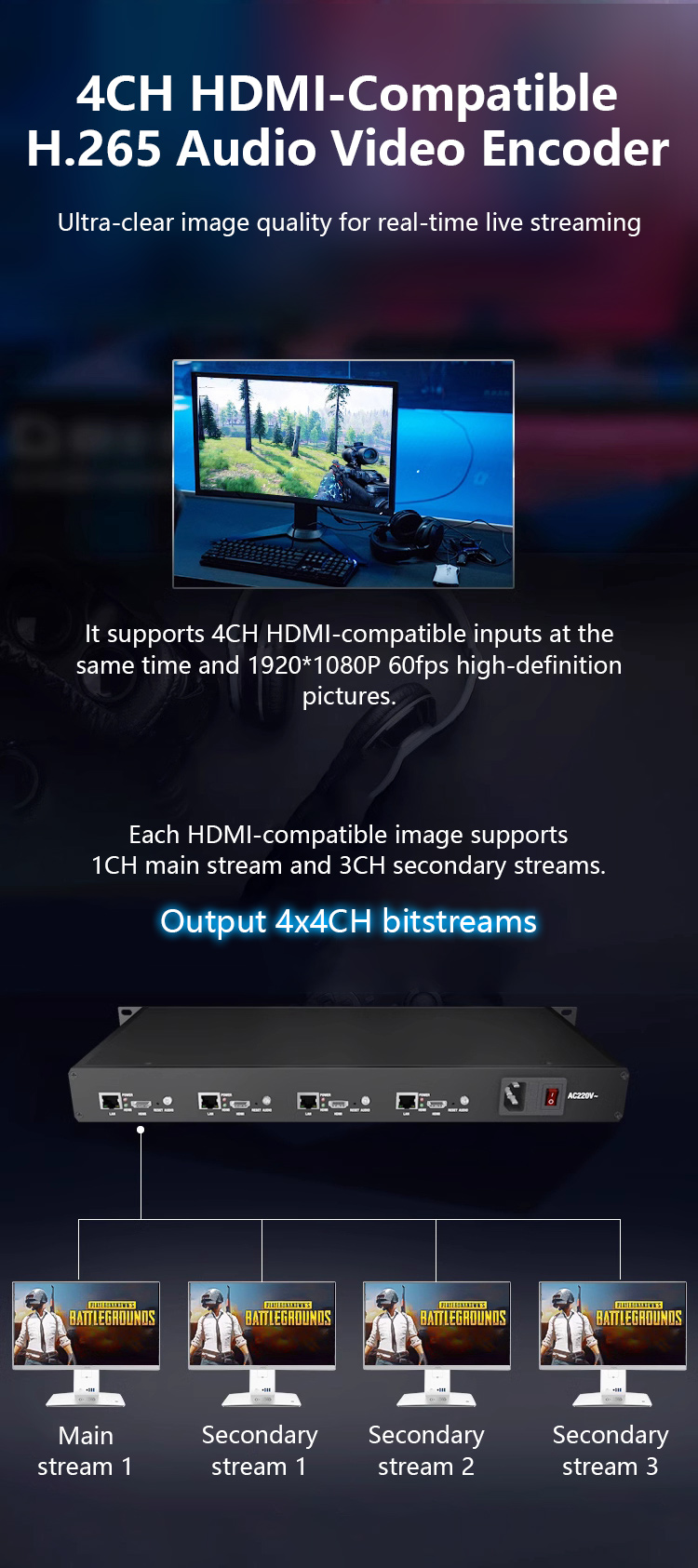 - 4CH HDMI-compatible H.265 audio video encoder: Ultra-clear image quality for real-time live streaming. It supports 4CH HDMI-compatible inputs at the same time and 1920*1080P 60fps high-definition pictures